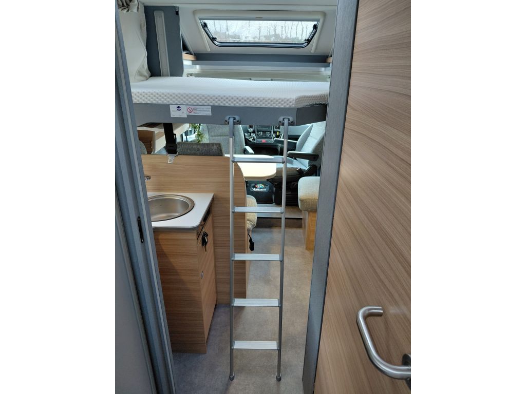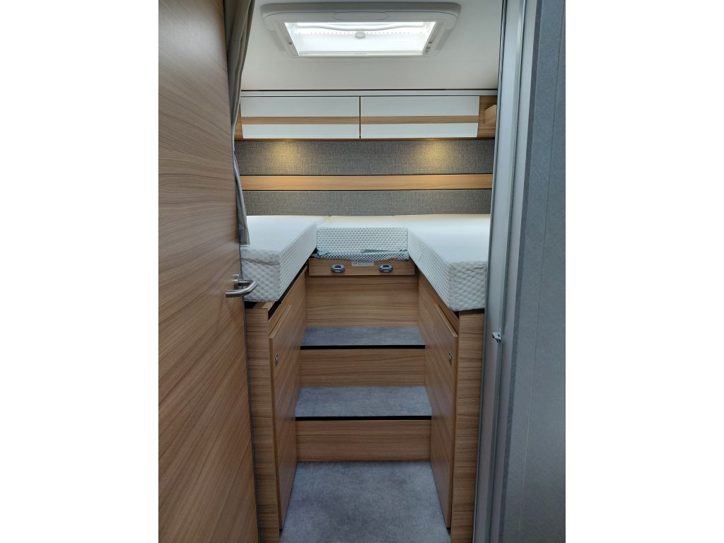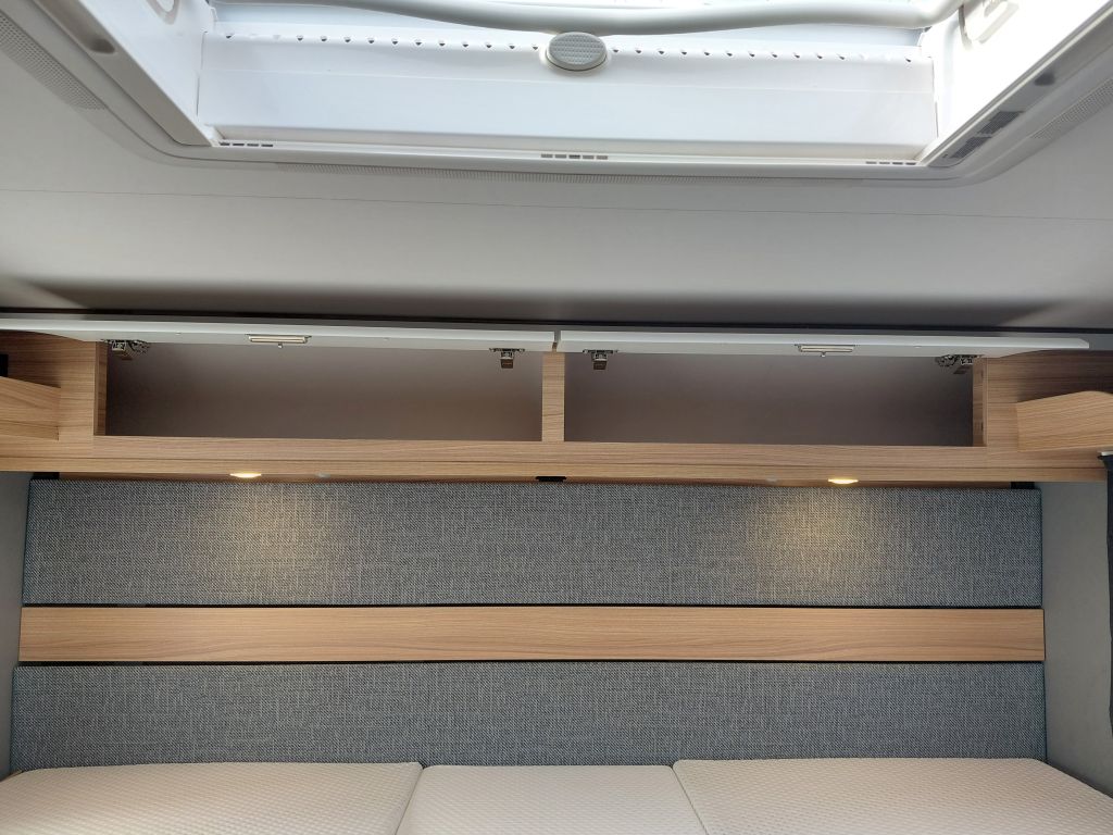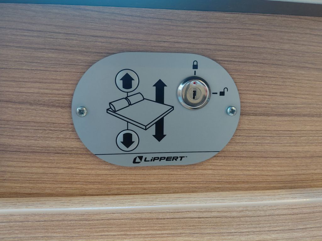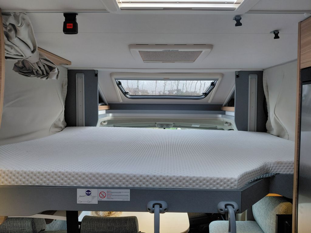 - Además, incorpora una cama basculante eléctrica sobre el salón que se eleva y baja con facilidad, proporcionando un dormitorio extra sin perder espacio útil.