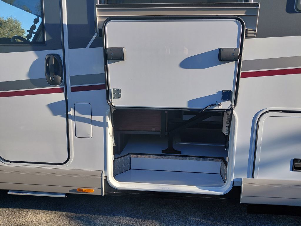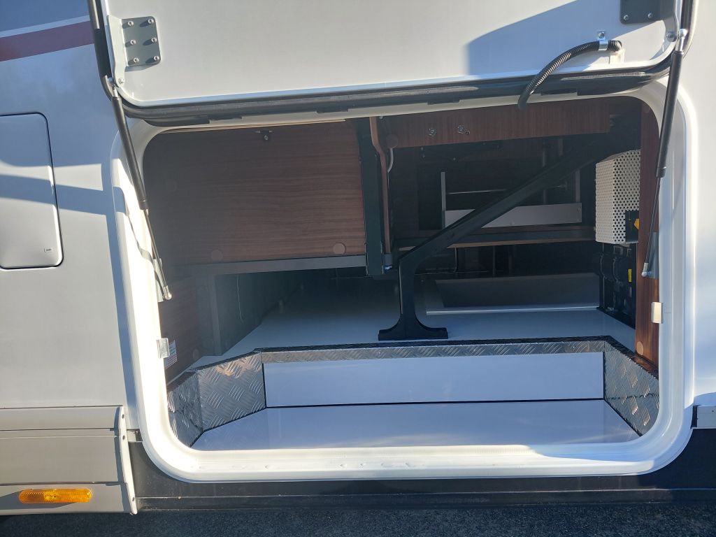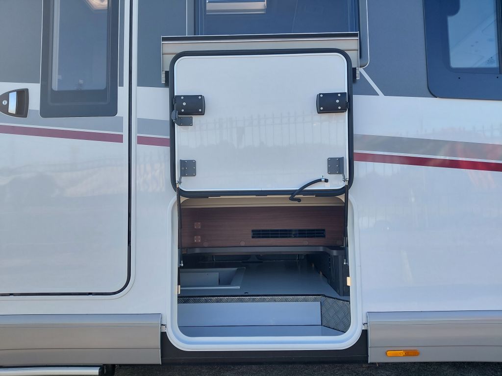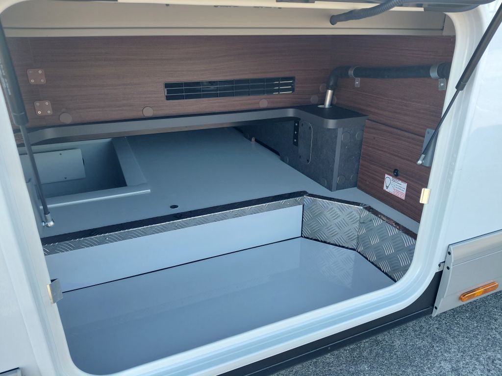 - Gran espacio de carga pasante central (altura interior 22 cm), con compartimento de almacenamiento extrabajo (altura útil 46 cm), también cómodamente cargable a través de la puerta de habitabilidad XL mediante una gran trampilla autoportante del piso del habitáculo