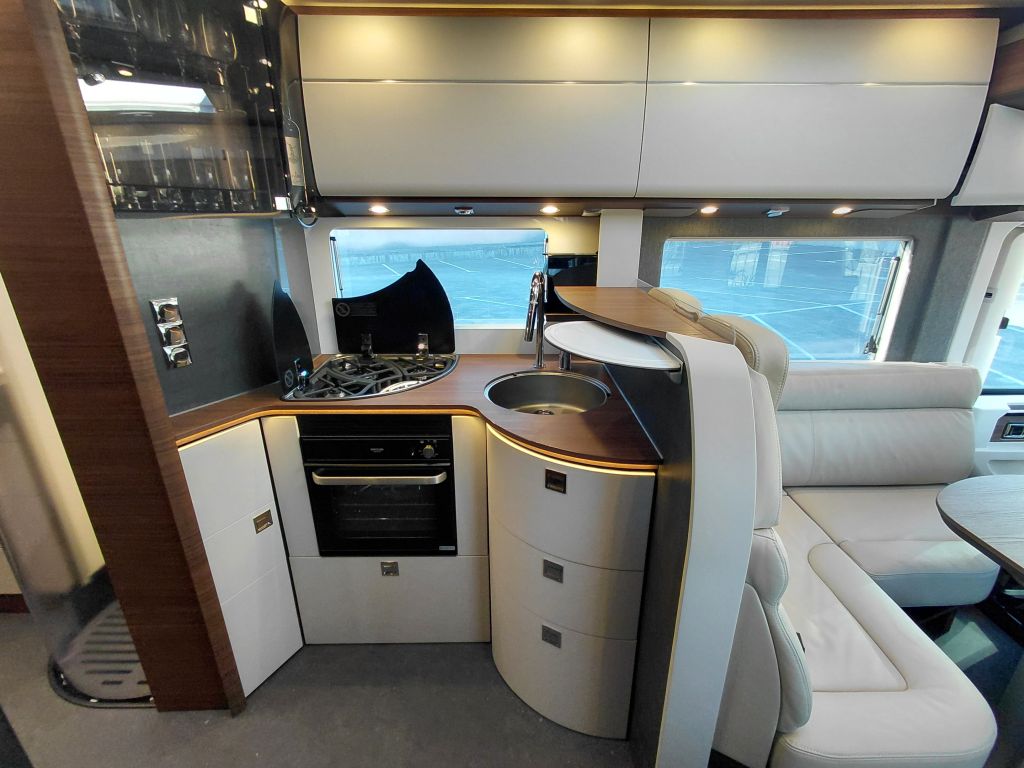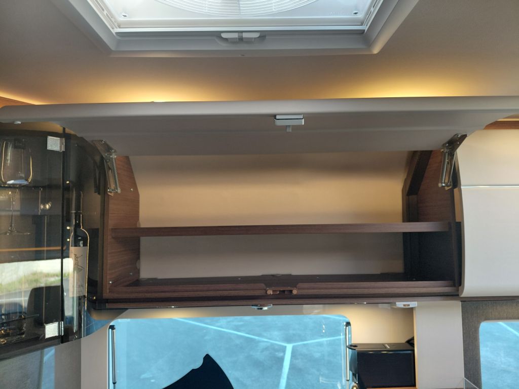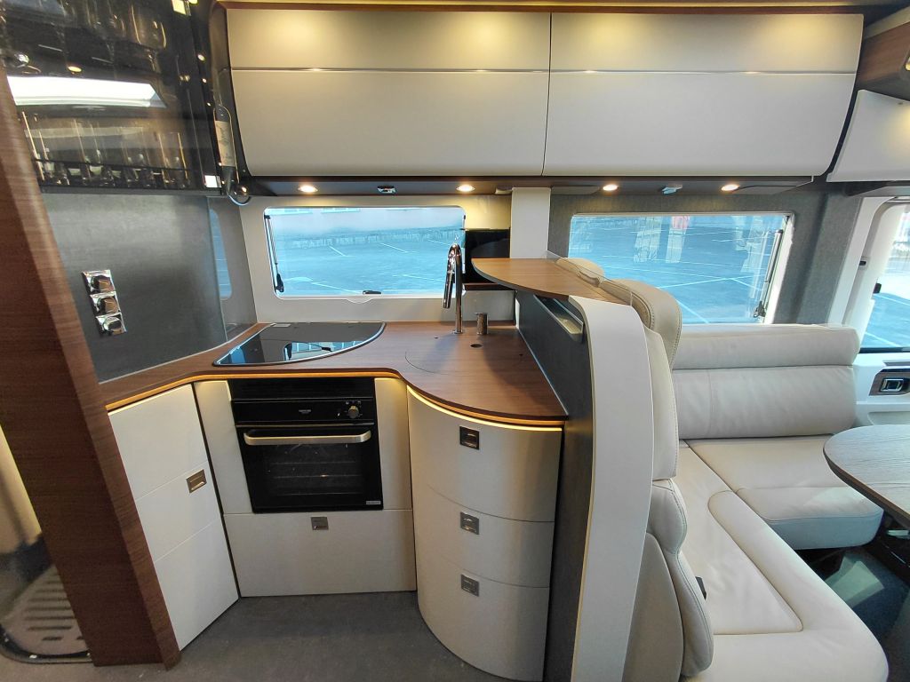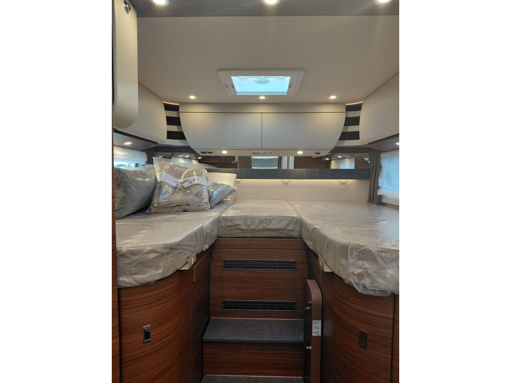 Gracias a la **amplia zona de asientos **del salón con tapicería ergonómica, la cocina rinconera confort con mucho espacio, incluido un armario extraíble y el baño XL con cambiador completamente separable, la chic c-line proporciona el máximo factor de bienestar en sus viajes. Las camas fijas con el sistema de descanso Carawinx de punto elástico completan el interior a la perfección.
