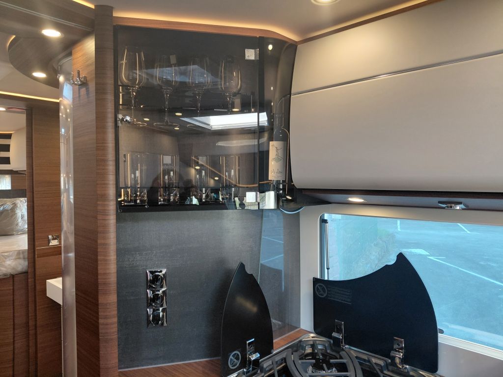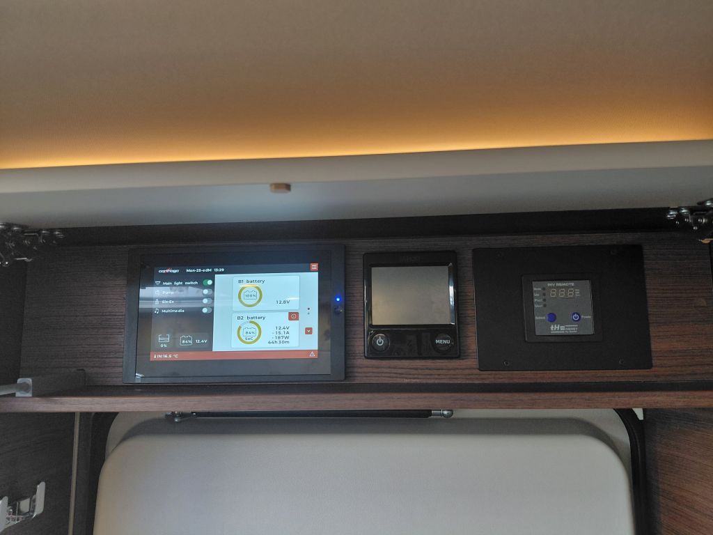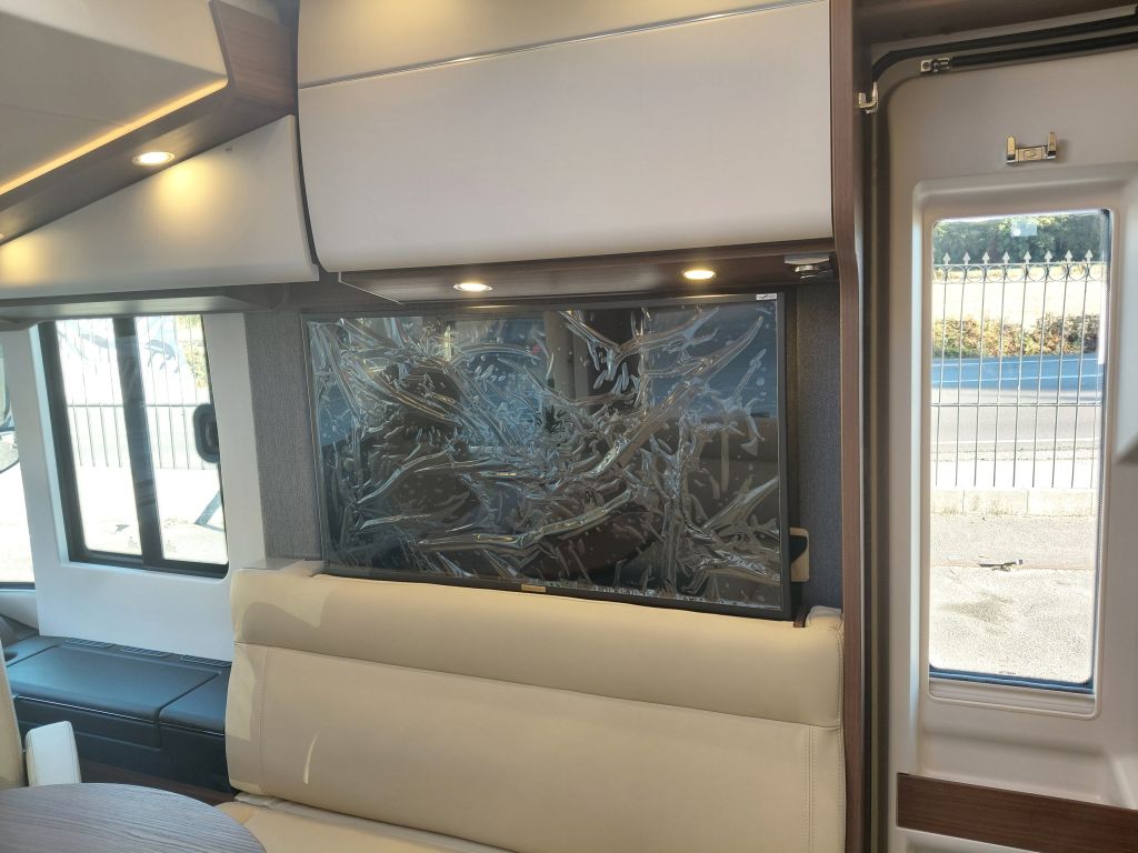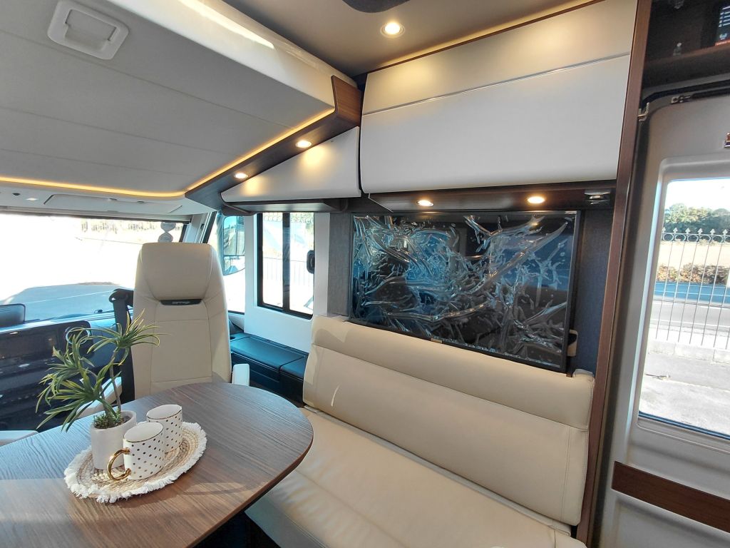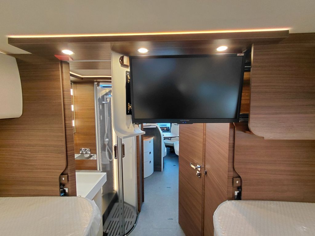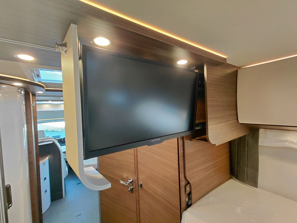 Paquete media de TV en el dormitorio y en el salón. El paquete de TV de dormitorio equipa a la autocaravana con un mueble de TV con sistema de extracción especial para TV y una TV LED Smart de 24”, mientras que el paquete de la sala de estar incluye un sistema de extracción eléctrica para TV LED Smart y una TV LED Smart de 40”.