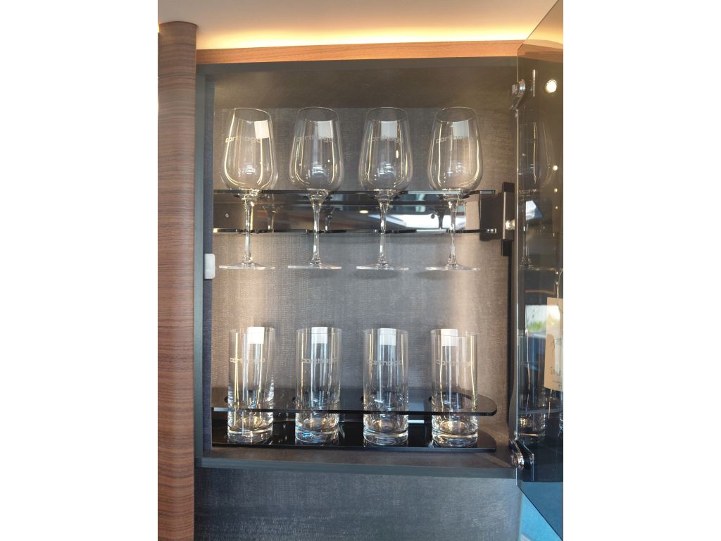 - Mueble bar de diseño con portavasos y juego de cristal sobre la cocina