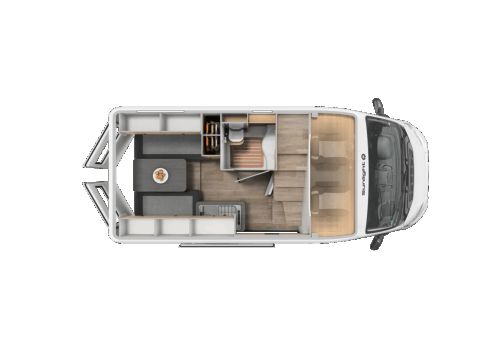 Habitáculo y descanso El interior destaca por su techo elevable con cama de alta calidad, accesible mediante escalera fija. Además, el habitáculo está separado del chasis con una pared termoaislante que asegura confort térmico. El almacenamiento ha sido diseñado para optimizar todo el espacio interior del vehículo, para ello incluye compartimentos en puertas trasera y corredera. Los armarios y estantes están distribuidos por su interior y cuenta con un garaje trasero con 4 anillas de sujeción. Además, dispone de una mesa extraíble en el salón, acolchados ergonómicos y mesa de camping multi-funcional incluida.