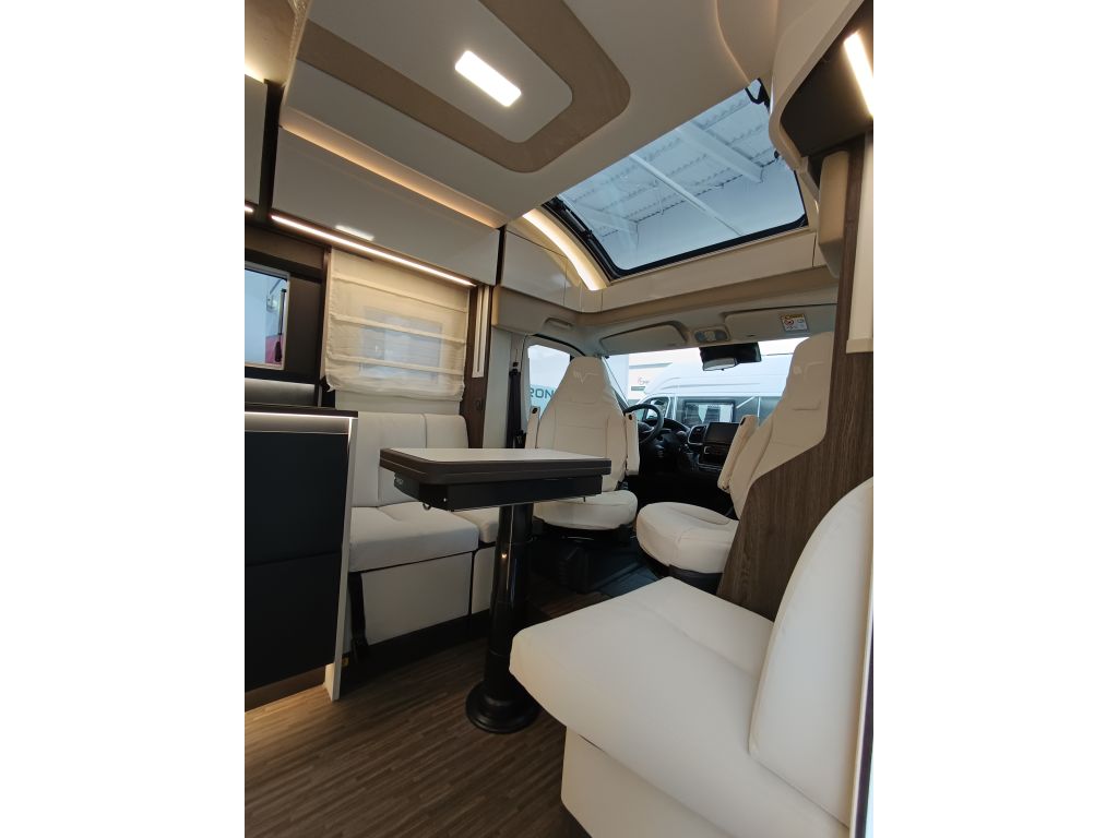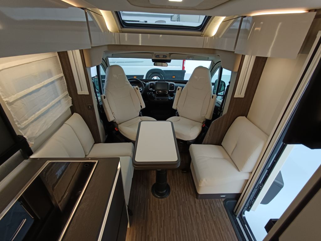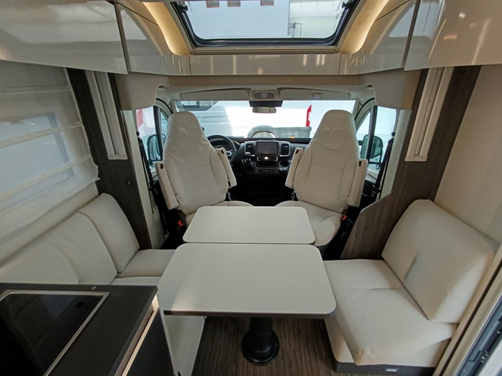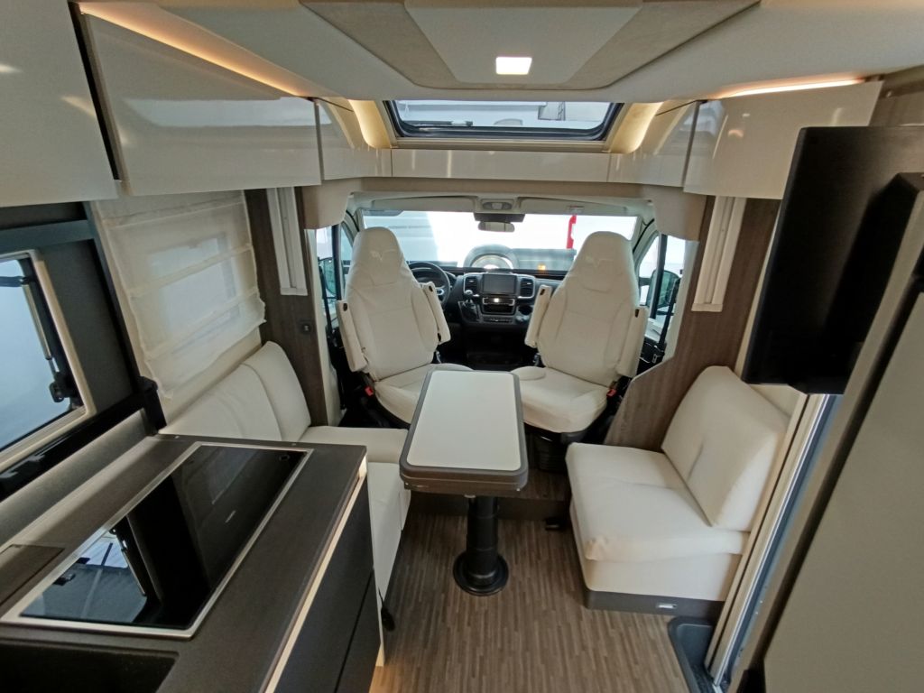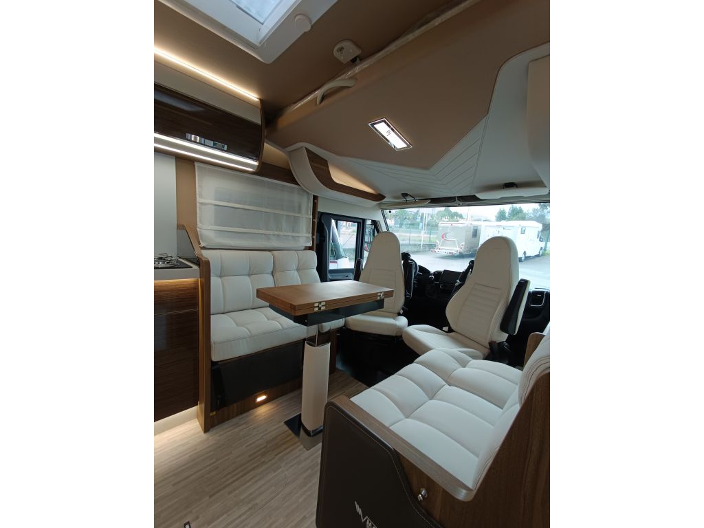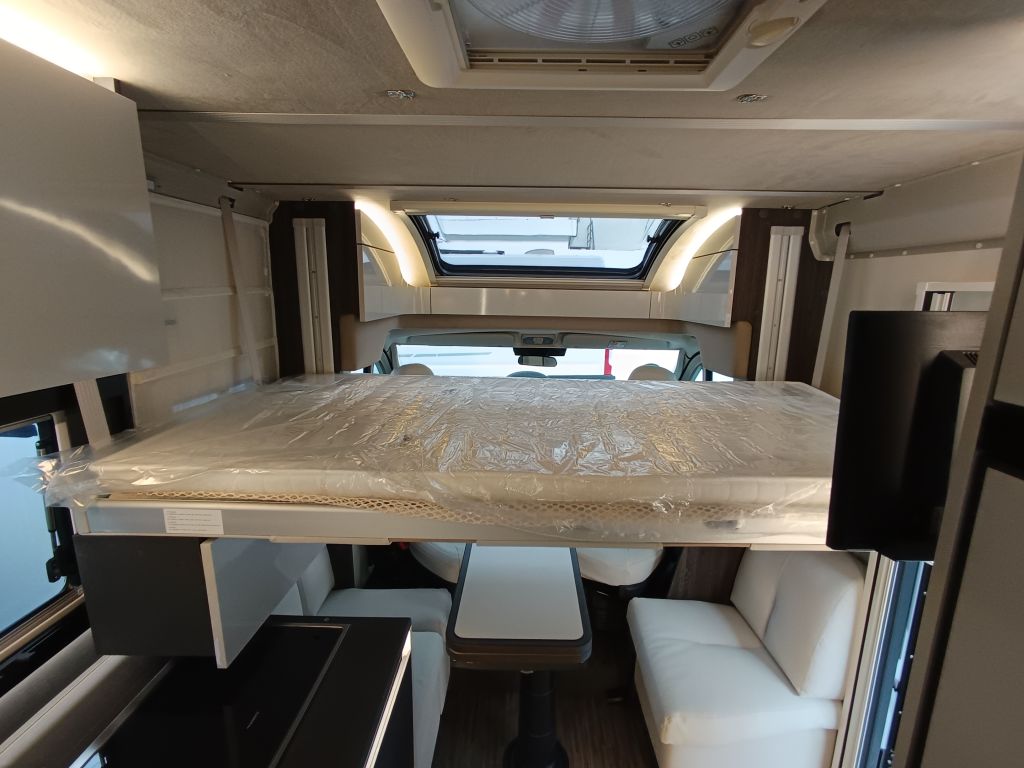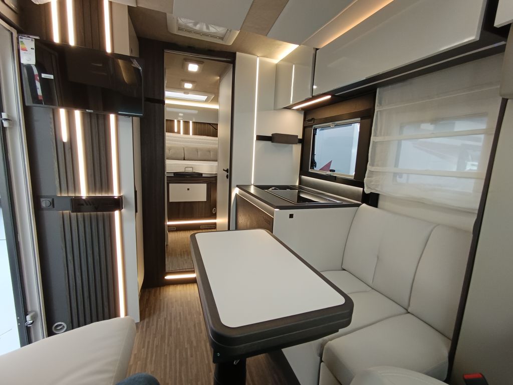 La distribución interior ofrece un ambiente acogedor y funcional, con cama central tipo isla, salón convertible y baño con ducha independiente. Los materiales, la iluminación LED y el mobiliario italiano aportan una sensación de exclusividad y confort que distingue a Mobilvetta en su categoría.