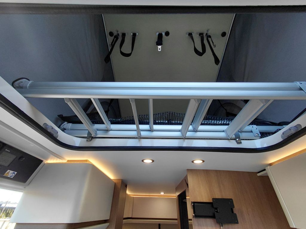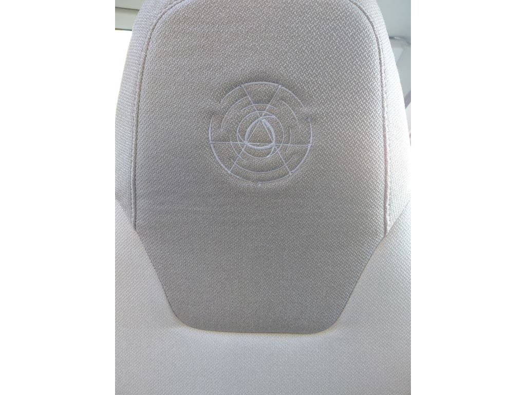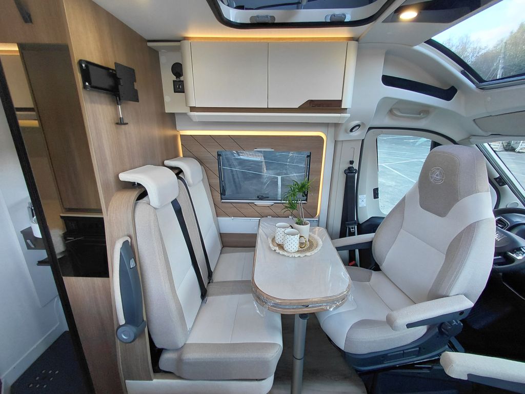 El equipamiento de cabina de la furgoneta camper Dreamer D43 UP incluye un techo panorámico skyview, los asientos de la cabina cuentan con un bordado especial por los 20 años de Dreamer.