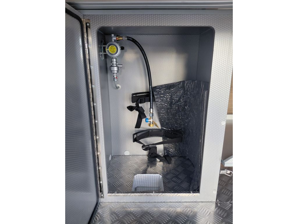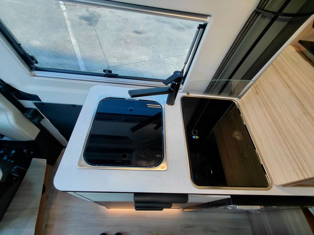 La cocina de la Dreamer D43 UP está formada por un maxi fregadero de acero inoxidable liso con tapa de cristal negro brillante equipado con un grifo de cocina de latón con cartucho cerámico y una placa de cocina de acero inoxidable con dos fuegos y tapa de cristal. Para completar el equipamiento de este espacio se ha dotado a este camper con una tabla de cortar que sirve también como extensión de la encimera y retroiluminación del mueble de la cocina.