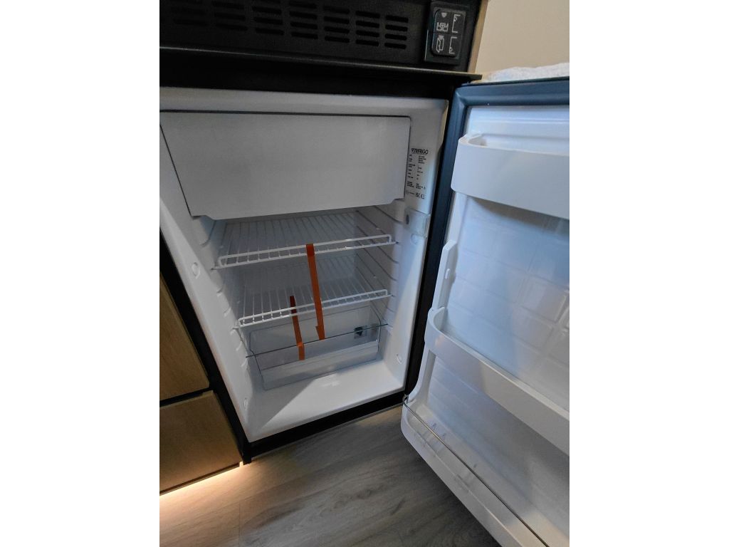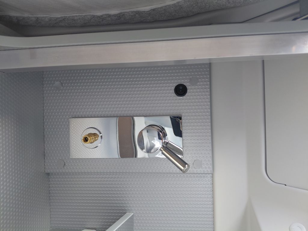 El cuarto de baño de la Dreamer D43 UP es el DUO’SPACE con pared giratoria que ayuda a optimizar los espacios, además, cuenta con compartimentos de almacenamiento, toallero, portavasos y vaso e iluminación LED.