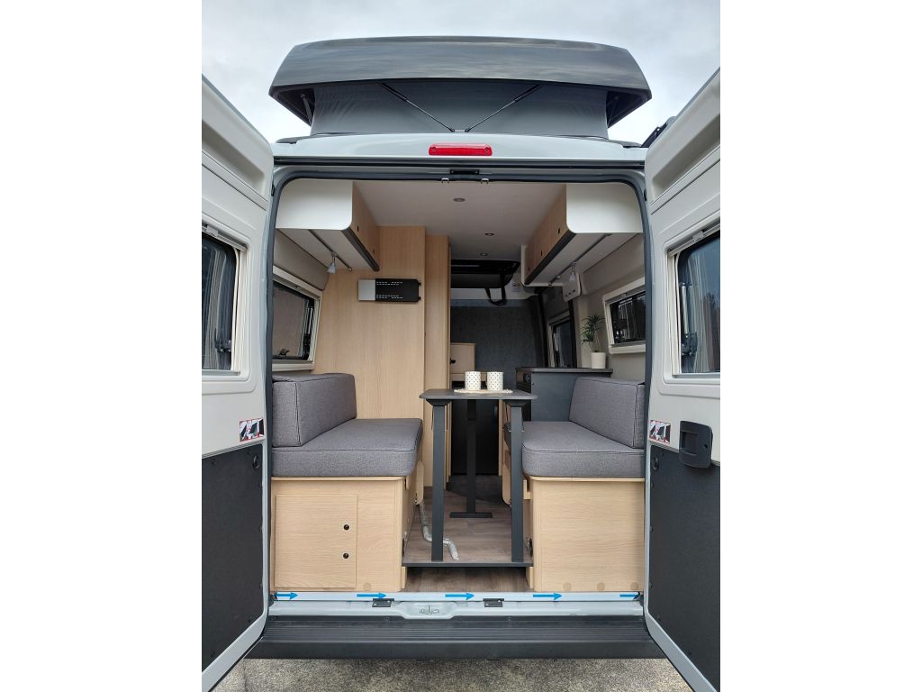 El habitáculo de la Sunlight Cliff 540 VanLife incorpora el techo elevable con claraboya panorámica, un garaje trasero con 4 anillas de sujeción integradas que facilita el amarre de la carga para aumentar su seguridad durante el viaje. Ambas puertas traseras incorporan ventana abatible con oscurecedor. Las ventanas abatibles del resto de la furgoneta tienen doble cristal e incluyen oscurecedor y mosquitera.