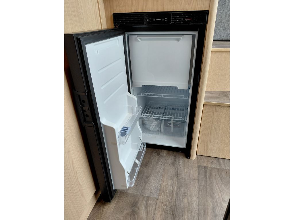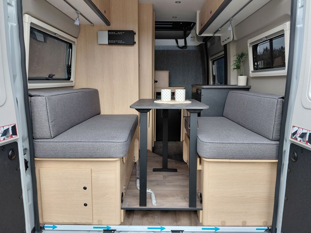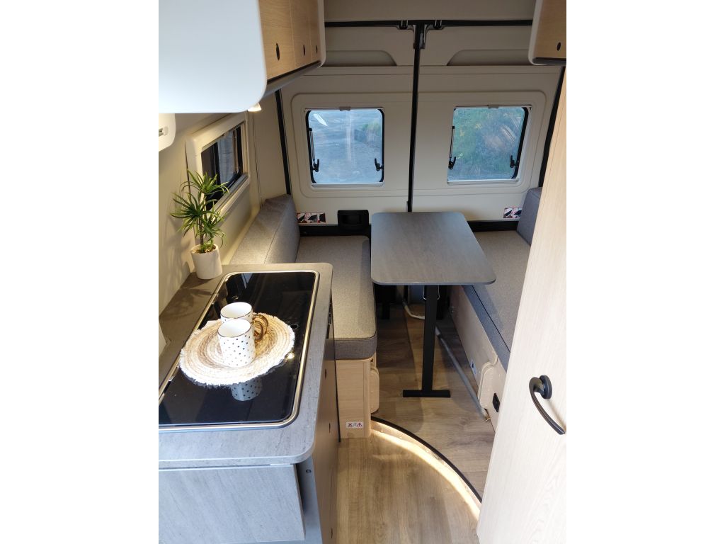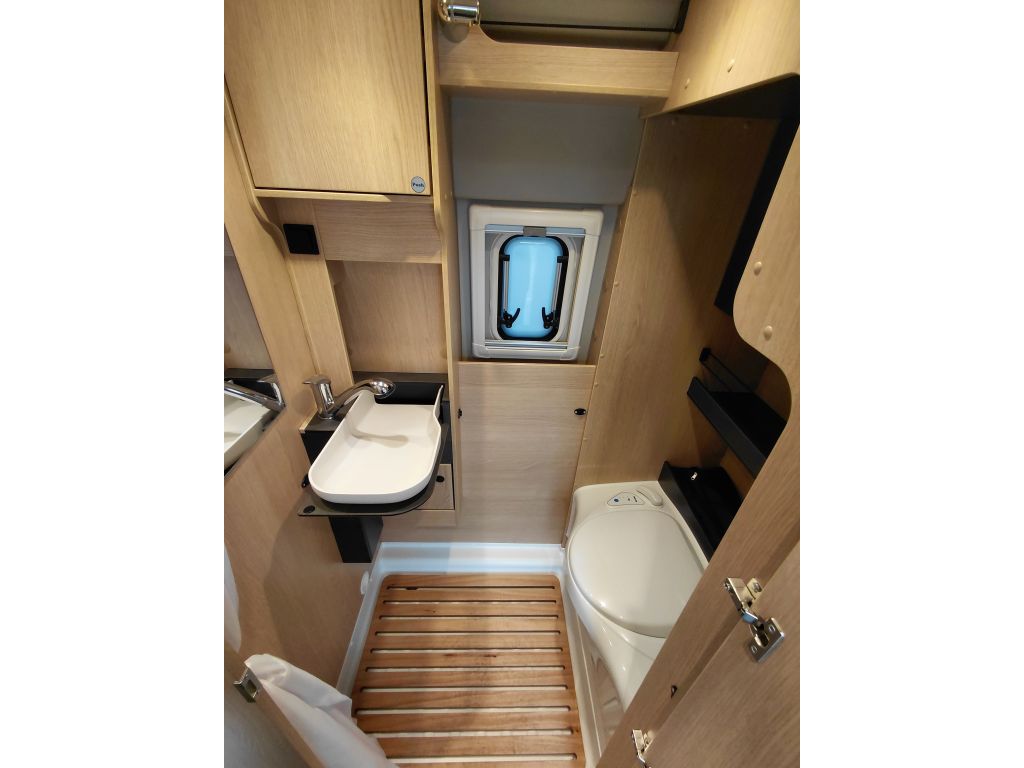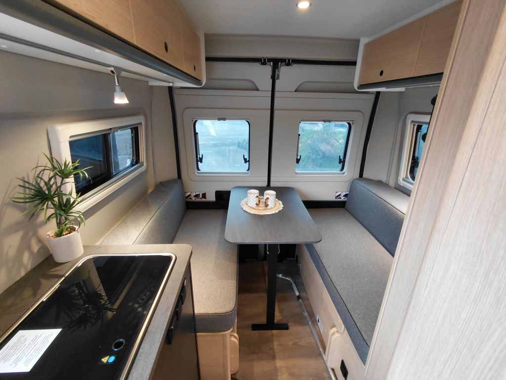 Sobre la cabina, se ha optimizado el espacio para ofrecer un práctico compartimento adicional, ideal para guardar objetos de uso frecuente. El chasis y el habitáculo están separados por una pared termoaislante, lo que mejora el confort térmico en cualquier época del año. La mesa multifunción puede utilizarse tanto en el interior como en el exterior, ampliando las posibilidades de uso en cada parada. Los acolchados ergonómicos y los colchones de alta calidad garantizan un descanso óptimo, mientras que los armarios, estantes y compartimentos ofrecen una amplia capacidad de almacenamiento.