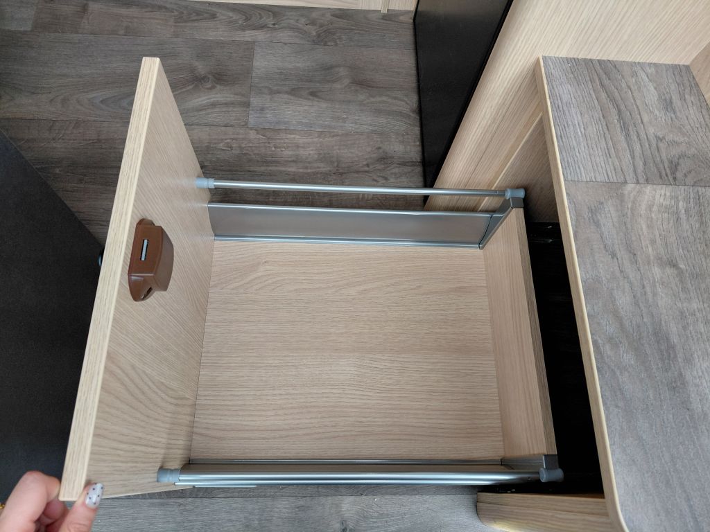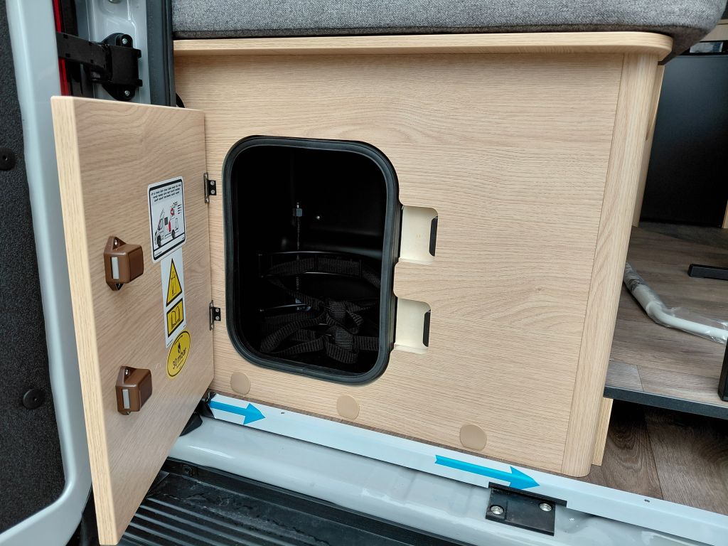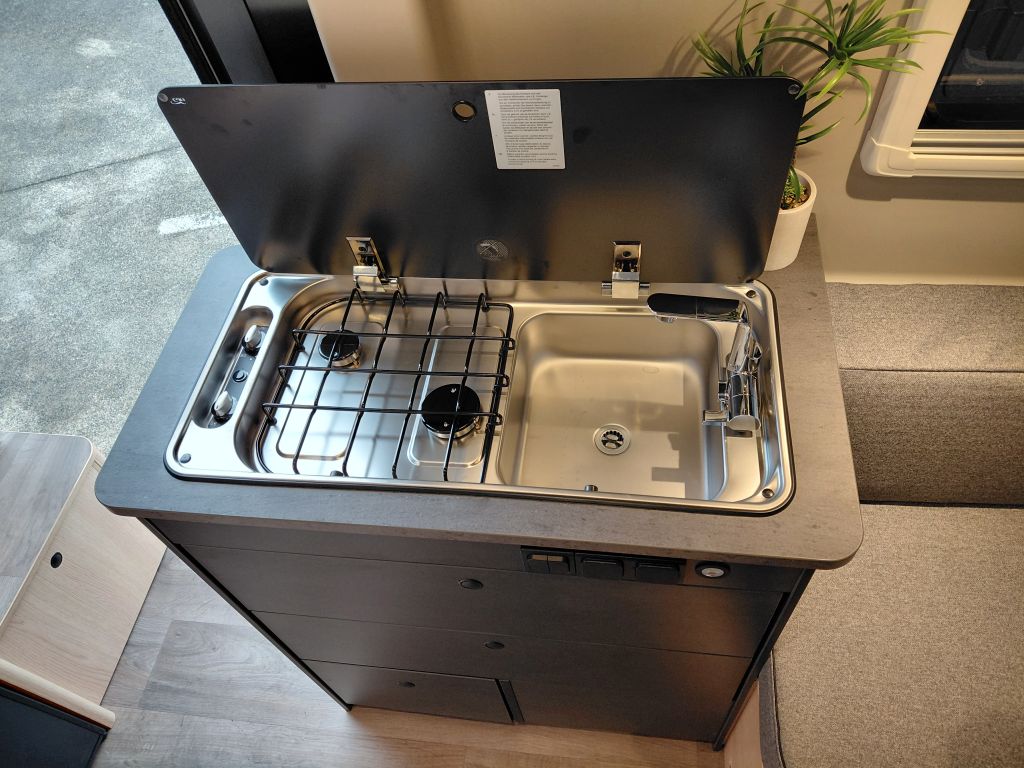 La cocina de la Sunlight Cliff 540 Vanlife está dotada con un frigorífico de compresor 64L y una cocina de 2 fuegos a gas con encendido eléctrico y tapa de cristal sobre un mueble con 3 cajones con cierre Servo-Soft. Incluye una ampliación de encimera para facilitar la zona de trabajo y una guía multifuncional con 2 colgadores que permite tener las herramientas y utensilios de cocina ordenados y a mano. La capacidad del depósito de agua potable es de 100L mientras que la de aguas residuales es de 90L.