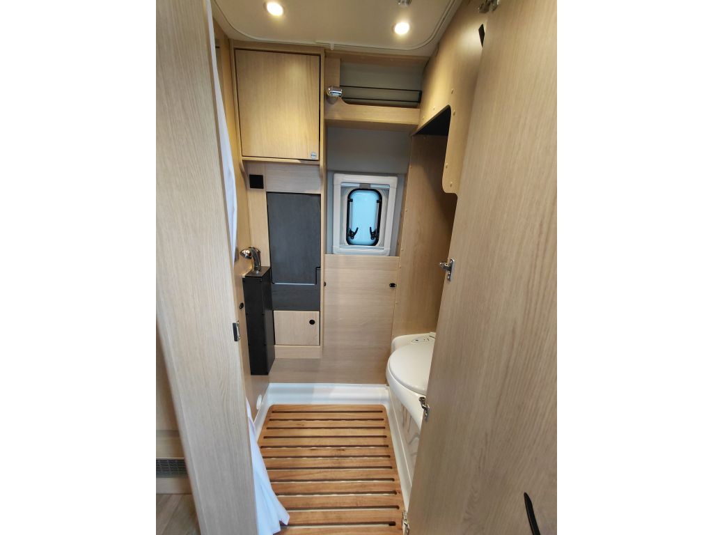El cuarto de aseo de este camper se caracteriza por la amplia ducha, el lavamanos abatible, un armario grande y una amplia superficie para depositar enseres que se completa con un inodoro fijo.