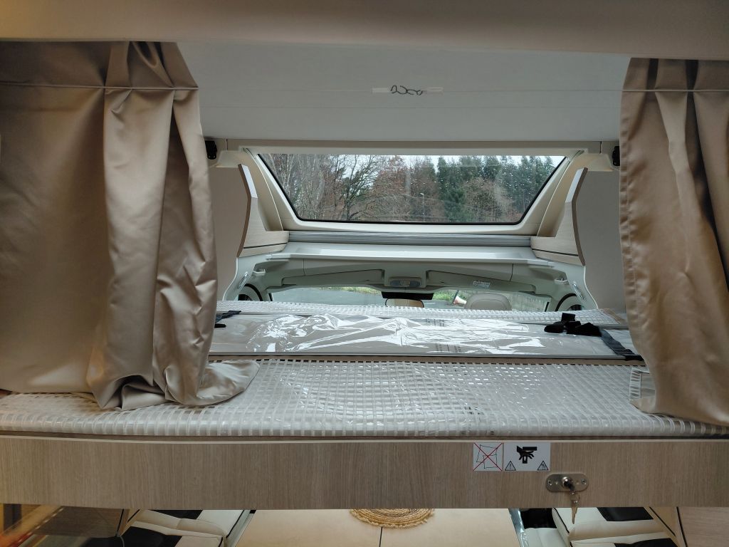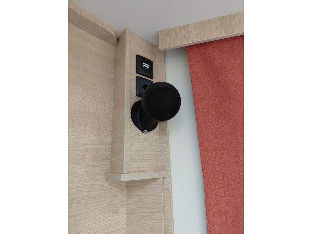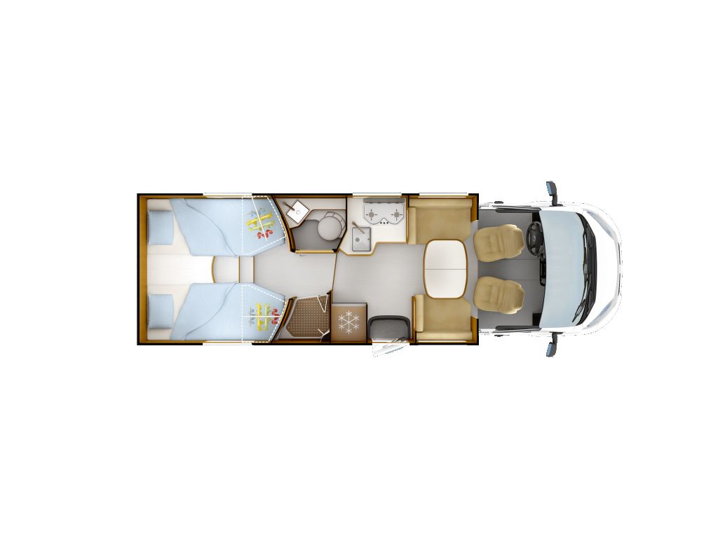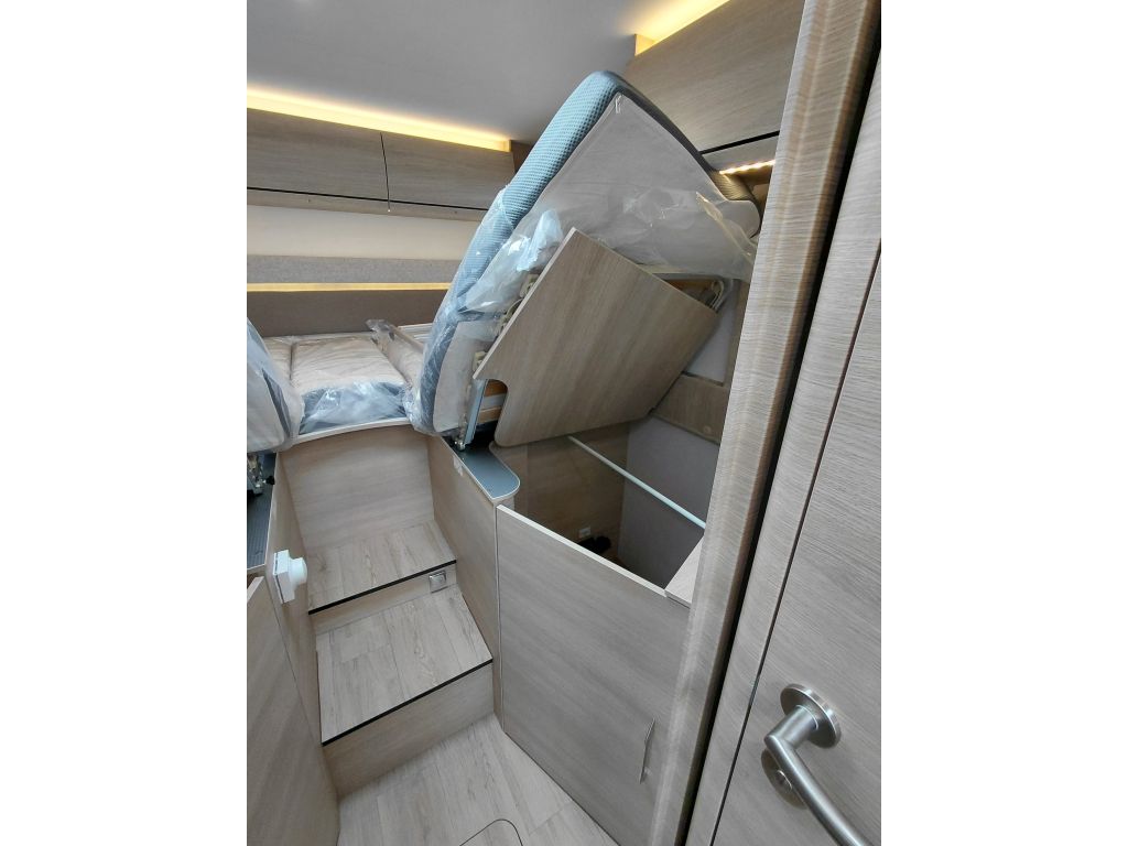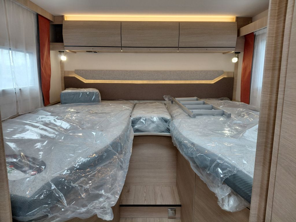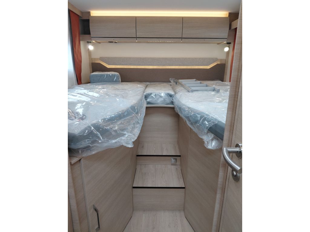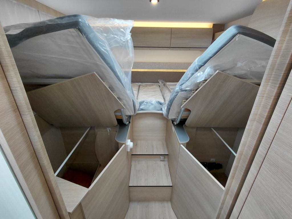 La zona de descanso de esta autocaravana Rapido 666F está formado por dos camas fijas gemelas con somier de marco de aluminio con láminas activas y colchón de espuma BULTEX de alta resiliencia, el cabecero de la cama incluye retroiluminación y revestimiento de tejido. Por su lado, el spot bajo los muebles altos incluye tomas de USB integrada. En el dormitorio se incorpora un espacio para una segunda TV con precableado 12V – coaxial – HDMI.