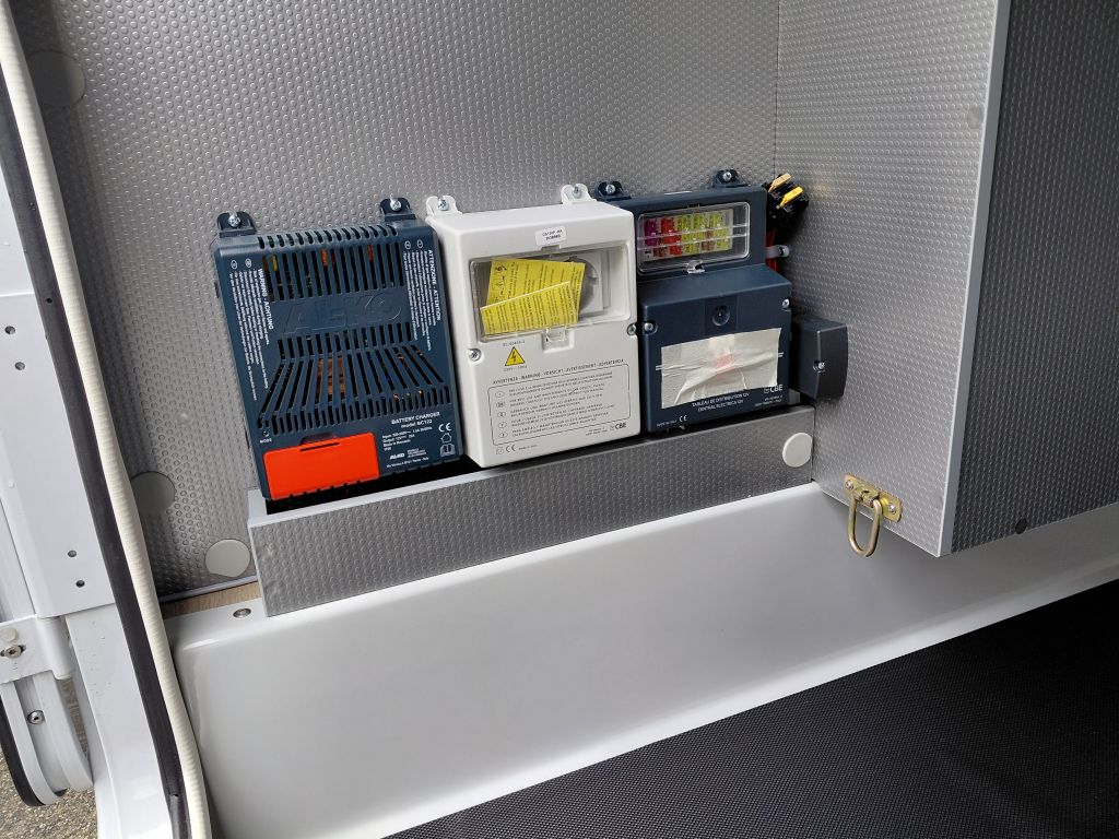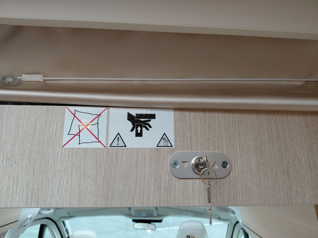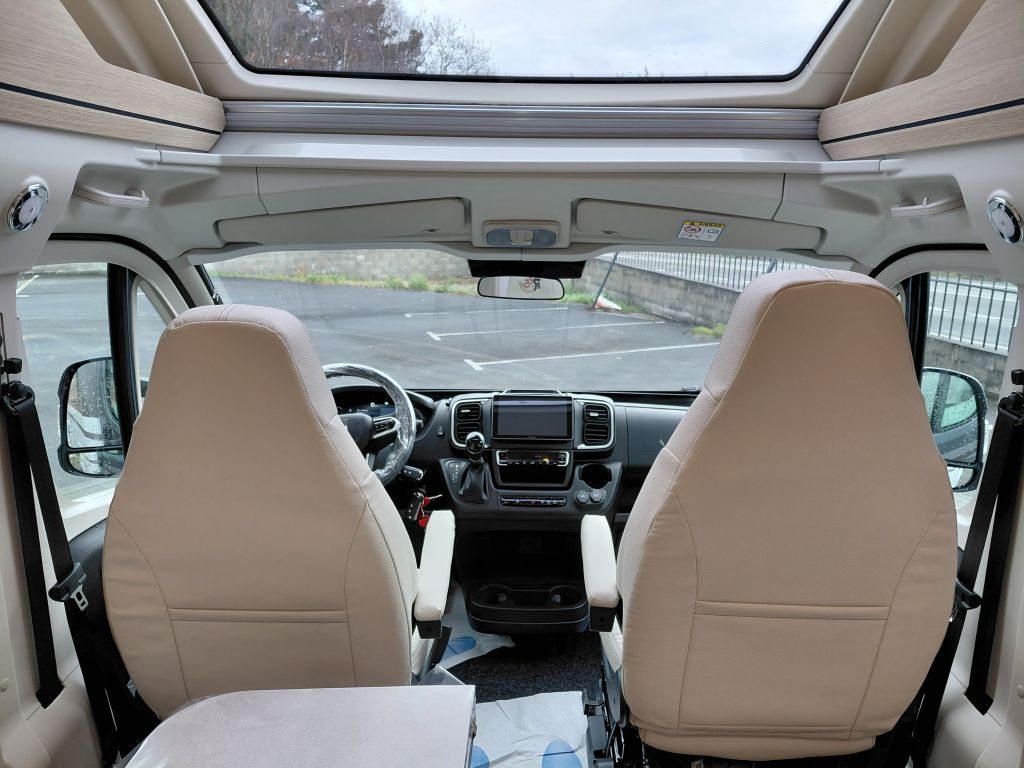El equipamiento de la cabina destaca por su comodidad y funcionalidad, incorporando elevalunas eléctricos en ambas puertas y un práctico spot de lectura touch en la zona de conducción. El revestimiento del suelo en la unión entre cabina y vivienda es de fácil mantenimiento, pensado para un uso diario cómodo y duradero. Los asientos de la cabina cuentan con reposacabezas bordados, aportando un acabado cuidado y elegante, mientras que la consola central integra portavasos para mayor practicidad durante el viaje.