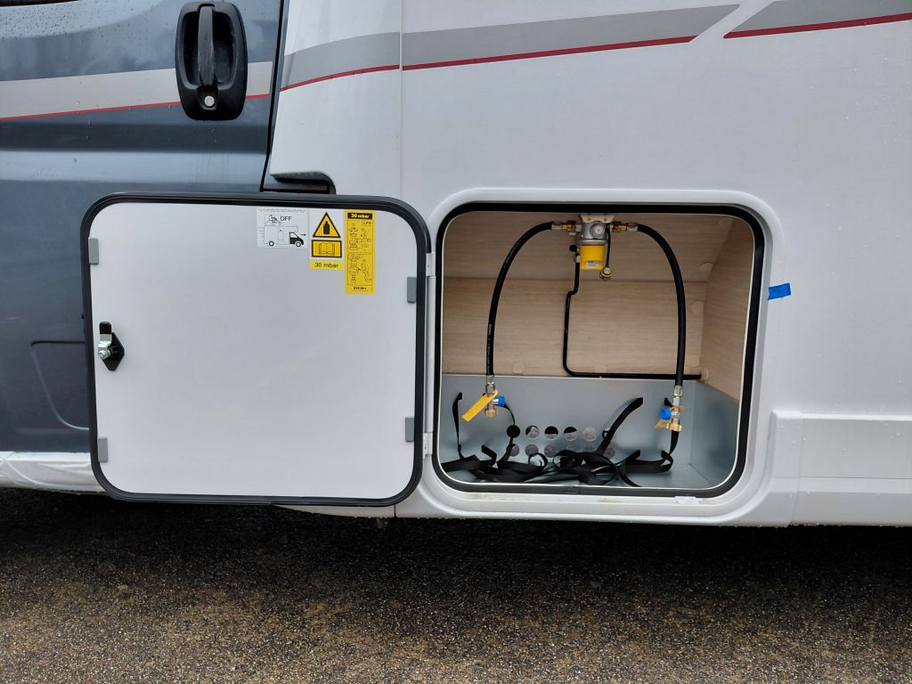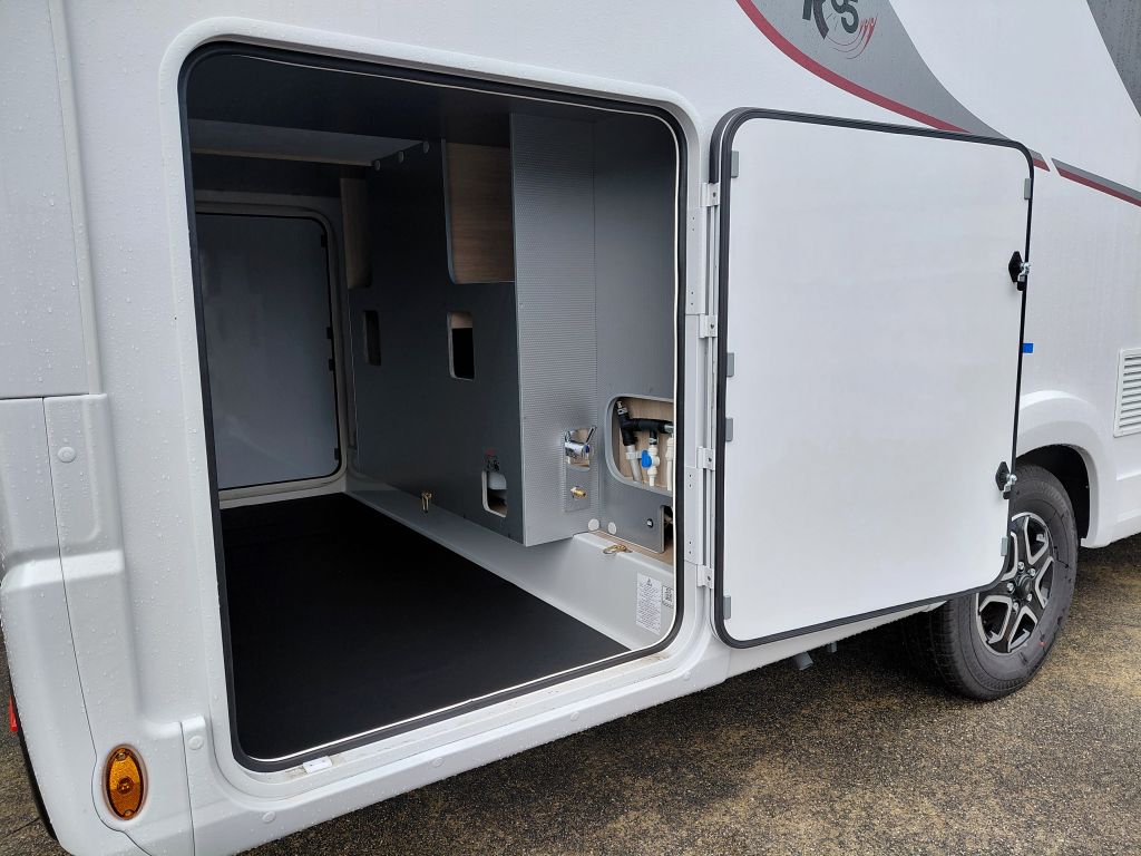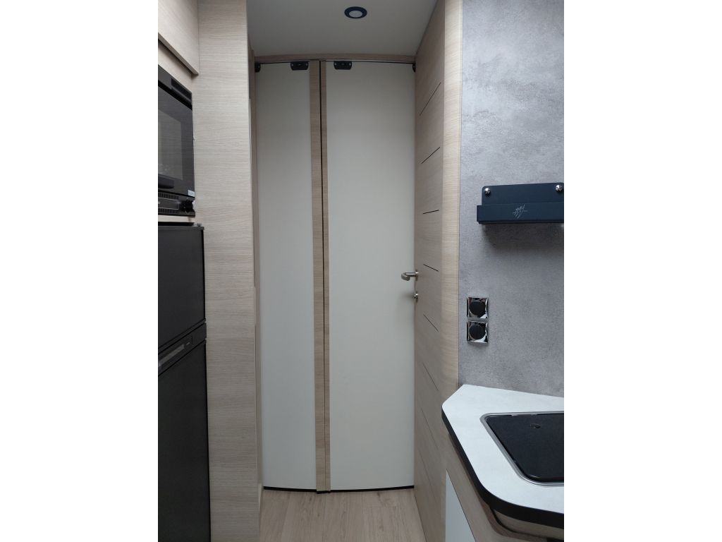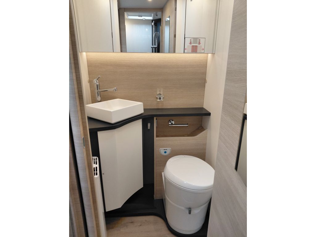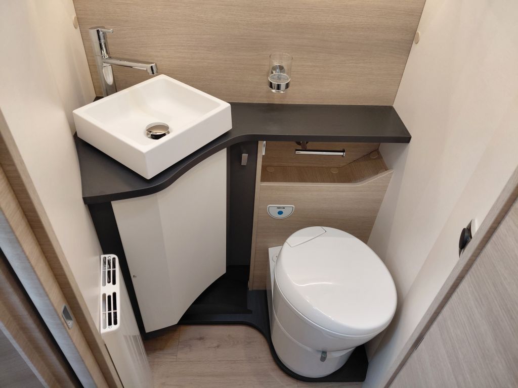 El cuarto de baño destaca por ofrecer una mayor privacidad gracias a su ducha independiente. En el espacio de aseo encontramos un práctico mueble de almacenamiento con dos puertas de espejo y el logotipo RAPIDO esmerilado, cuya puerta en blanco mate incorpora sistema de cierre push lock. La encimera del lavabo presenta un revestimiento laminado con acabado Alu Finish, de alta calidad y gran durabilidad. El lavabo, de diseño rectangular y termoformado, está equipado con grifo de latón giratorio y cartucho cerámico. Por su parte, la columna de ducha cuenta con un elegante revestimiento laminado en gris antracita. Ambos espacios disponen de claraboya con oscurecedor y mosquitera, incorporando además la zona de ducha una práctica barra para tender. Los accesorios del baño presentan un cuidado acabado cromado. El compartimento termoformado extraíble del depósito del WC permite un mantenimiento rápido y sencillo. Además, el sistema de agua limpia incluye vaso de expansión para garantizar una presión constante, mientras que la alcachofa de la ducha incorpora función de ahorro de agua.