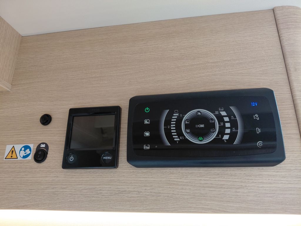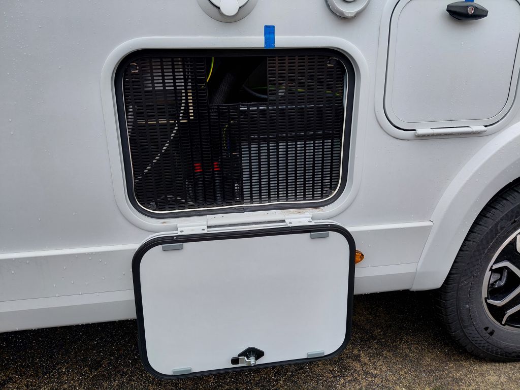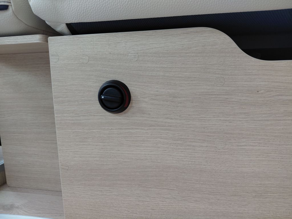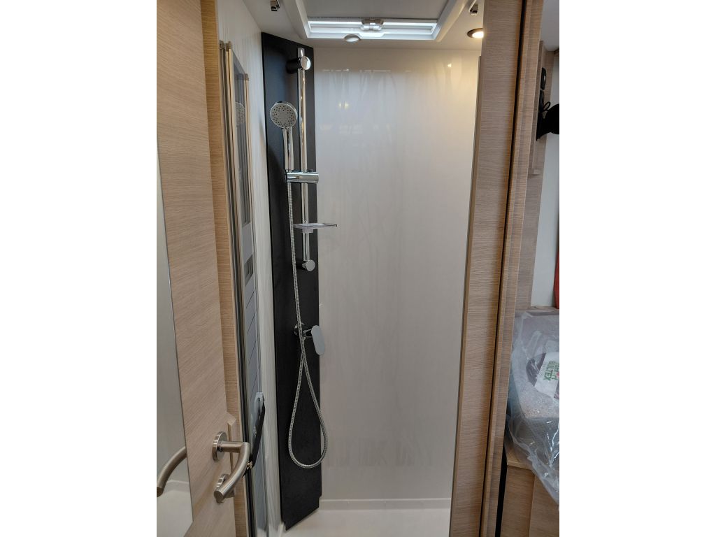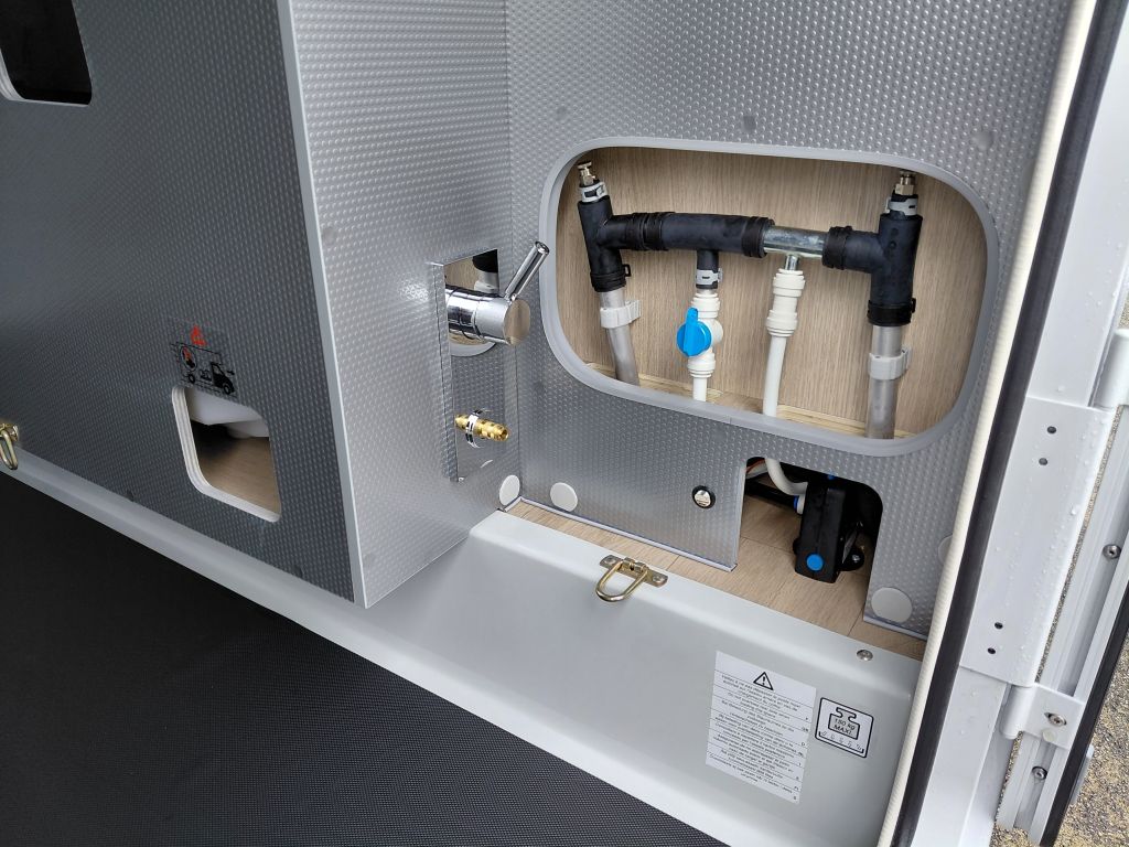 El cuarto de baño destaca por ofrecer una mayor privacidad gracias a su ducha independiente. En el espacio de aseo encontramos un práctico mueble de almacenamiento con dos puertas de espejo y el logotipo RAPIDO esmerilado, cuya puerta en blanco mate incorpora sistema de cierre push lock. La encimera del lavabo presenta un revestimiento laminado con acabado Alu Finish, de alta calidad y gran durabilidad. El lavabo, de diseño rectangular y termoformado, está equipado con grifo de latón giratorio y cartucho cerámico. Por su parte, la columna de ducha cuenta con un elegante revestimiento laminado en gris antracita. Ambos espacios disponen de claraboya con oscurecedor y mosquitera, incorporando además la zona de ducha una práctica barra para tender. Los accesorios del baño presentan un cuidado acabado cromado. El compartimento termoformado extraíble del depósito del WC permite un mantenimiento rápido y sencillo. Además, el sistema de agua limpia incluye vaso de expansión para garantizar una presión constante, mientras que la alcachofa de la ducha incorpora función de ahorro de agua.
