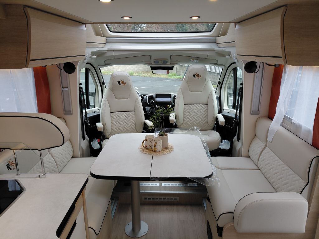 El salón de la autocaravana Rapido 666F permite su transformación de las plazas en sentido de la marcha en asientos del salón frente a frente, con reposabrazos en los asientos. La circulación en el espacio del salón facilitada sin escalón. Con mueble abierto para la TV de pantalla plana de 32”. Para favorecer la iluminación en este espacio, se incluye una gran claraboya de salón longitudinal con revestimiento de madera. La mesa con canto chapado en negro mate y pata telescópica es plegable y tiene revestimiento laminado. Además, el spot bajo de los muebles altos con toma USB integrada es en color negro mate. El respaldo de los asientos es imantado lo que facilita la conversión en plazas en sentido de la marcha.
