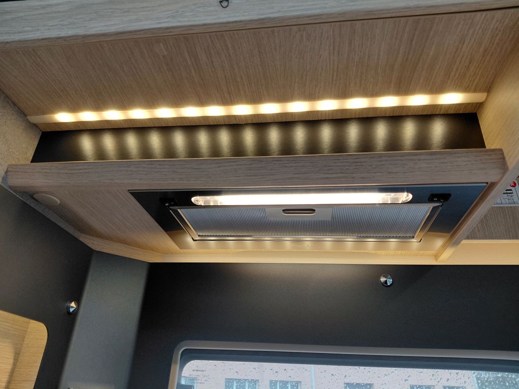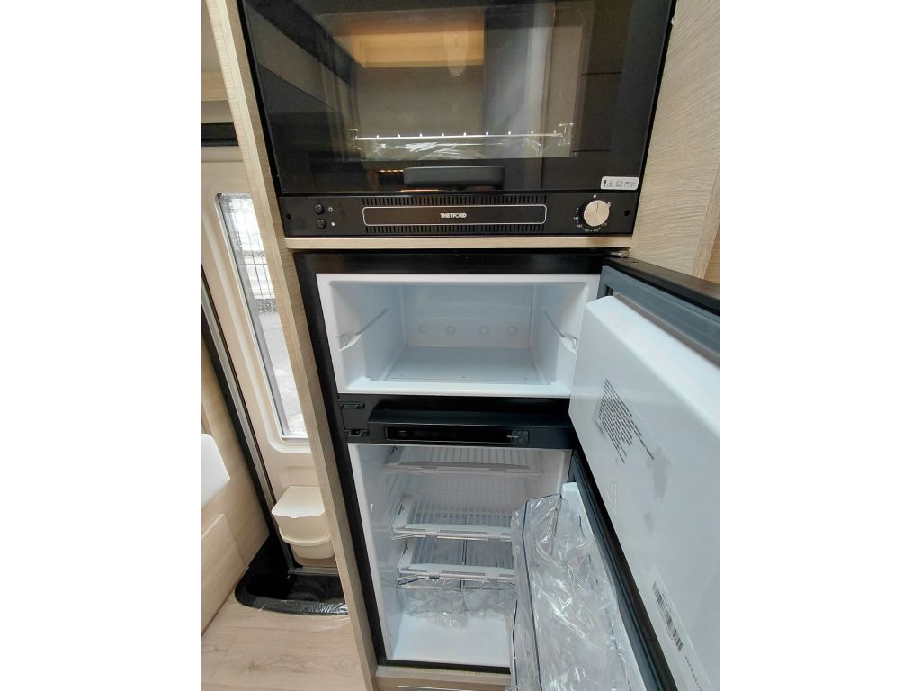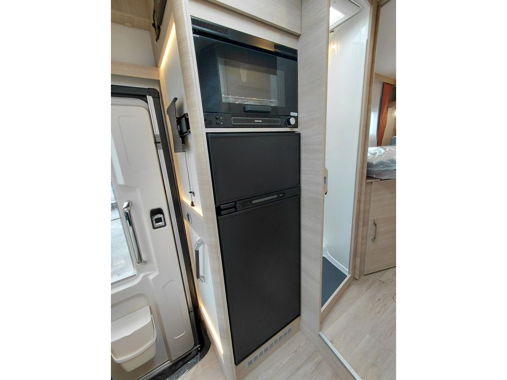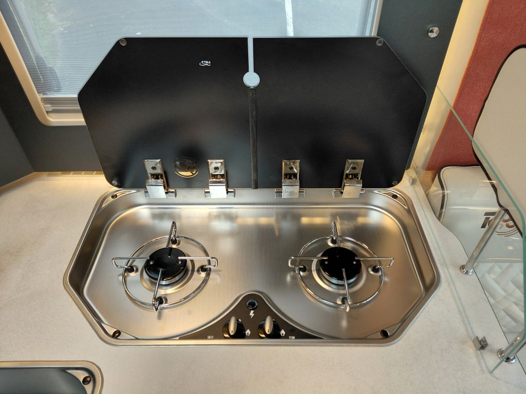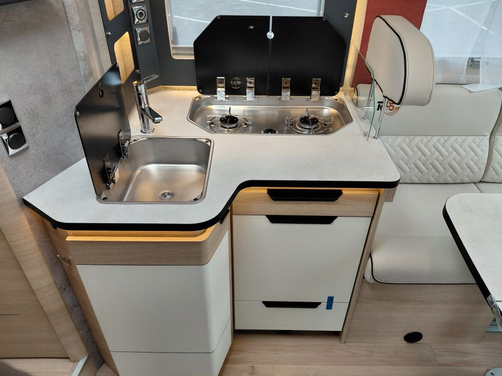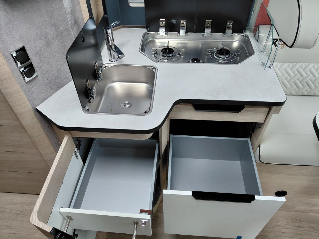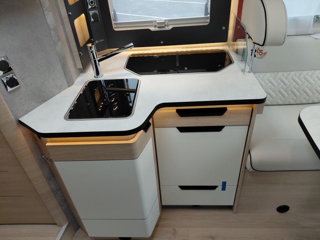 La cocina de la autocaravana perfilada Rapido 666F está compuesta por un mueble con cajones en la parte frontal en blanco y tiradores integrados de color negro mate, estos cajones son retráctiles y tienen cierre centralizado eléctrico automático al arrancar el motor. Con iluminación bajo la encimera que le da un toque sofisticado y elegante a esta estancia. Para proteger la ventana y la pared de esta zona, han sido revestidas con plexiglás con un portaespecias integrado y soporte con tomas de 230V y 12V. En el lateral de la cocina se incluye otro portaespecias adicional que facilitará mantener el orden en la cocina. El frigorífico es de absorción y gran capacidad 156L con congelador independiente. La cocina de 2 hornillos es de acero inoxidable gofrado, con tapas negras independientes y encendido piezoeléctrico. El grifo de la cocina es de latón cromado con cartucho cerámico mientras que el fregadero sigue la misma línea de estilo que la cocina y es de acero inoxidable con tapa de cristal negro brillante. Para completar el equipamiento de este lugar, incorpora un extractor de humo encastrado con iluminación LED.