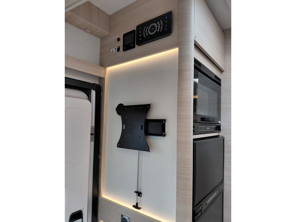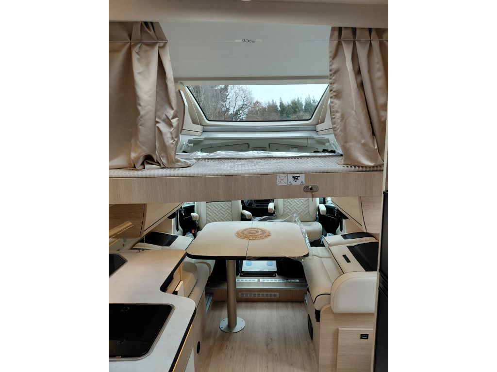 El interior de esta autocaravana es acogedor gracias a la iluminación de ambiente 100% LED del salón, cocina y dormitorio que le aporta calidez a las estancias combinando con la tapicería TEP y a las cortinas de paneles. El mobiliario del vehículo es LUCEO que se caracteriza por tener la puerta del armario alto en color madera con detalles en negro, el revestimiento lateral de la cocina es gris pizarra texturizado mientras que el del suelo es de tipo parquet de madera clara.