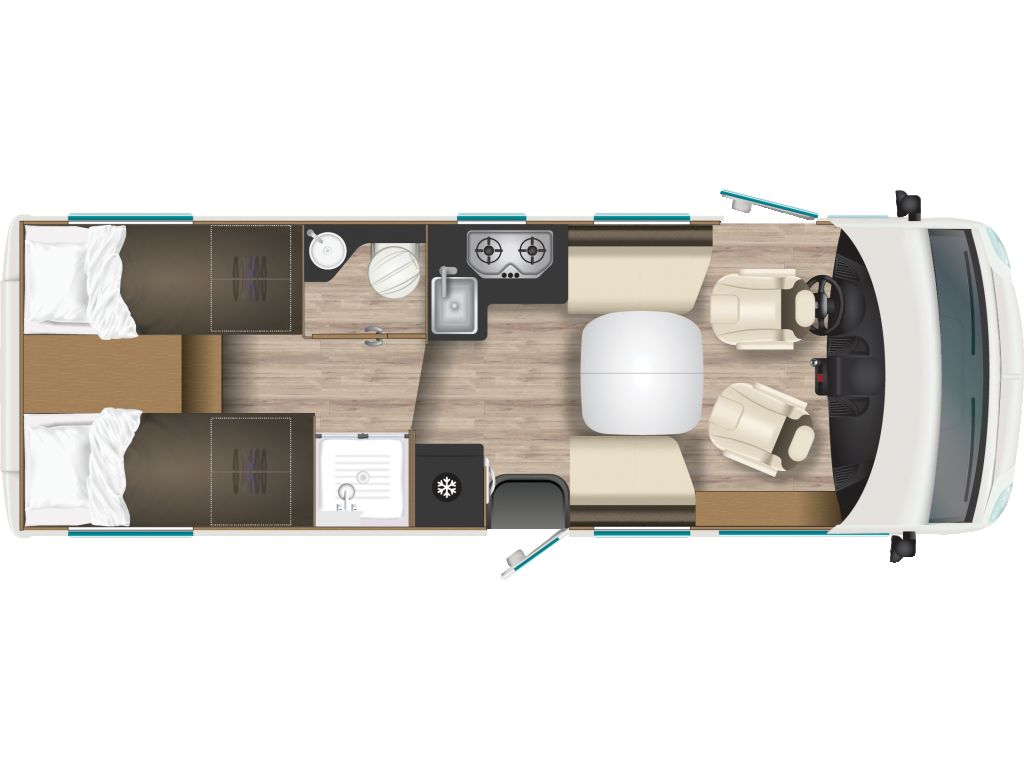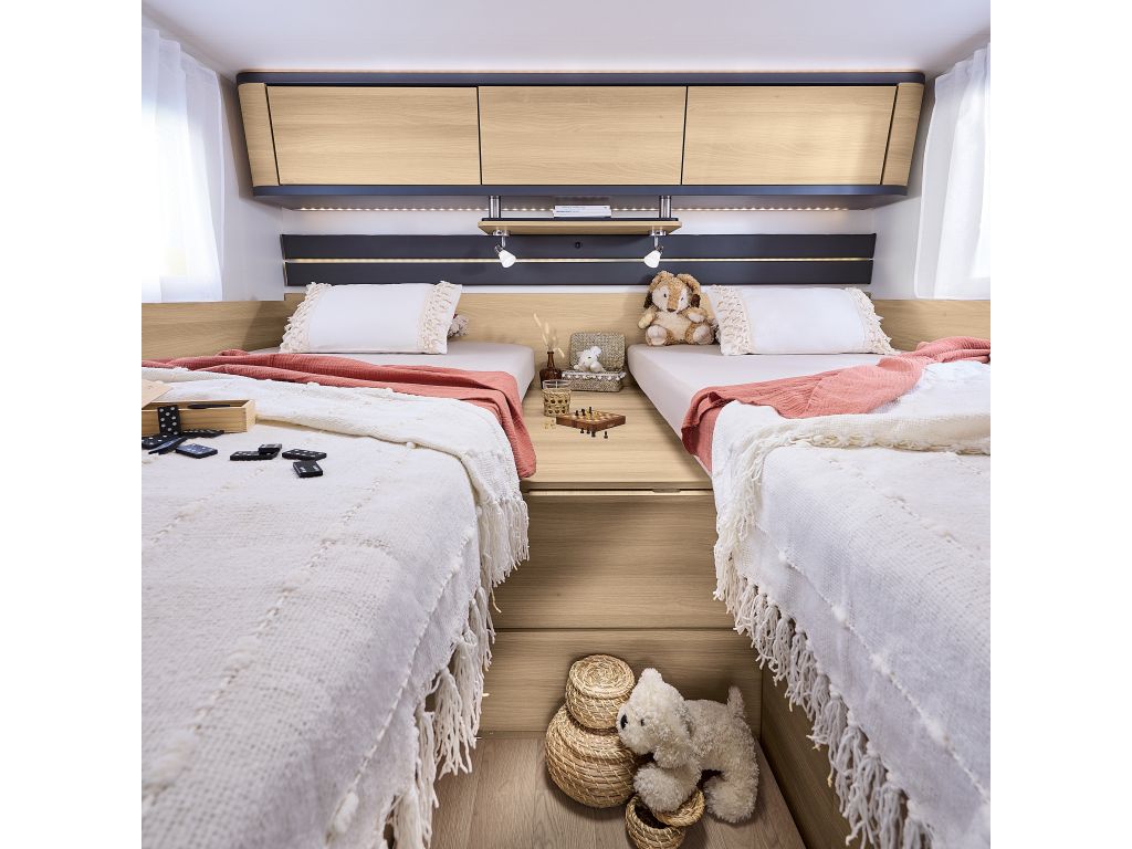 El dormitorio de la Itineo JC740 está configurado con dos camas gemelas, equipadas con colchones de espuma sobre somier de láminas, que garantizan un descanso cómodo y ergonómico. El revestimiento del colchón, confeccionado en tejido elástico de alta calidad, aporta una agradable sensación de confort y durabilidad. El conjunto se completa con un cabecero con retroiluminación integrada, que crea un ambiente acogedor, y un revestimiento TEP, resistente y fácil de mantener, cuidando tanto el diseño como la funcionalidad del espacio.
