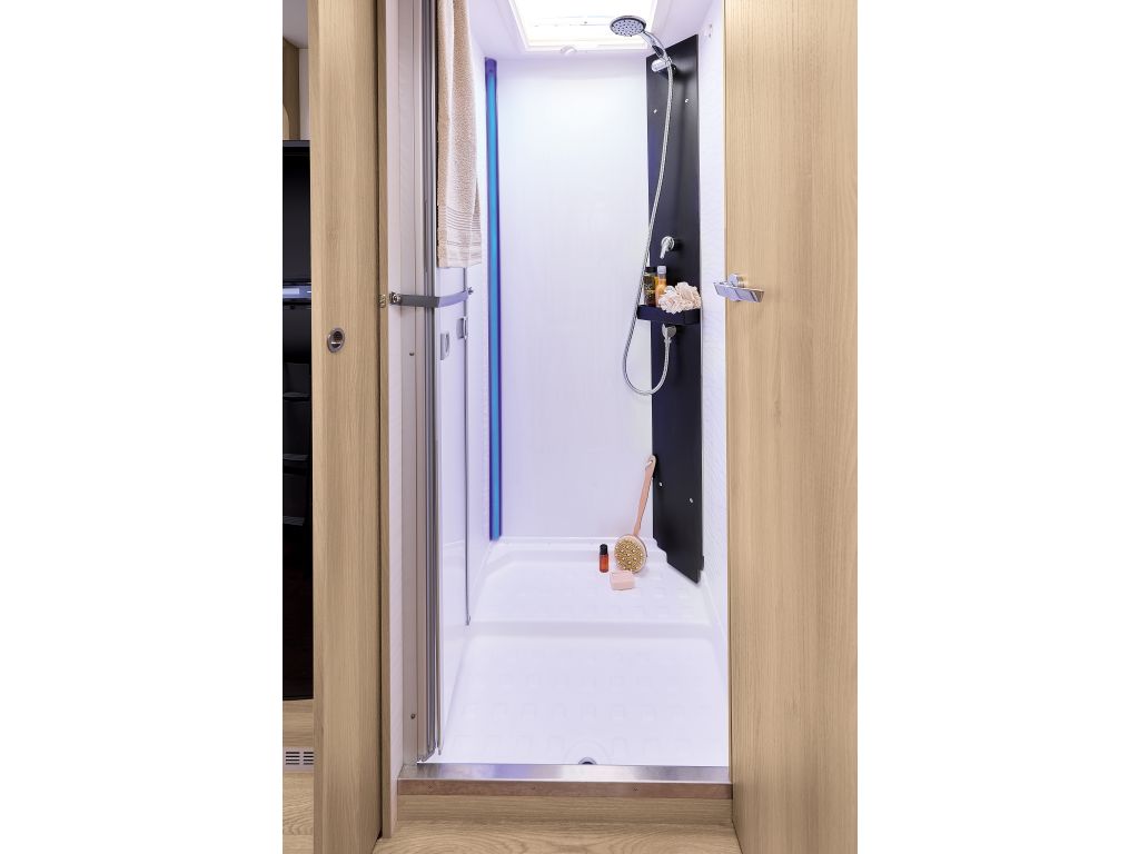 El cuarto de baño de la Itineo JC740 destaca por su espacio de almacenamiento se compone de un compartimento con retroiluminación bajo el lavabo que se completa con un mueble alto con espejo, con toma de 230V esta integrada en el panel superior. Otro aspecto destacado de este espacio es el WC de cerámica, la barra de armario extraíble y que la ducha está separada, ofreciendo mayor privacidad. La columna de la ducha incluye iluminación de ambiente LED azul, con revestimiento laminado negro y compartimentos de almacenamiento integrados. Para iluminar y ventilar la ducha hay una claraboya en el techo.