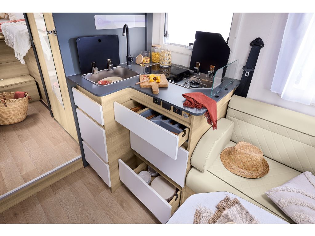 La cocina de la Itineo JC740 está diseñada para ofrecer funcionalidad, diseño y comodidad en cada detalle. Dispone de extensión de encimera, banda acrílica lateral con retroiluminación LED azul y portaespecias, optimizando el espacio y facilitando el uso diario. Incorpora un cajón cacerolero con freno al final del recorrido, fregadero de acero inoxidable con tapa de cristal negro brillante y cierre centralizado en los cajones, garantizando seguridad y practicidad durante la marcha. El equipamiento se completa con un grifo de latón con cartucho cerámico y una cocina de acero inoxidable de dos fuegos, con tapas negras independientes y encendido piezoeléctrico. Para una mayor autonomía, cuenta con un frigorífico de 145 litros, con selección automática de energía y puerta doble, además de obturadores de protección para el invierno en las rejillas exteriores del frigorífico, asegurando un rendimiento óptimo en cualquier época del año.