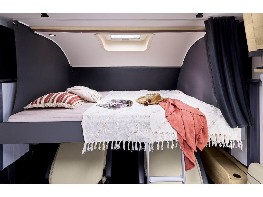 Uno de los grandes atractivos de la Itineo JC740 es su distribución con camas gemelas traseras, regulables en altura eléctricamente, que pueden transformarse fácilmente en una cama King Size de 160 x 217 cm, ofreciendo un descanso excepcional y una gran versatilidad en el espacio.