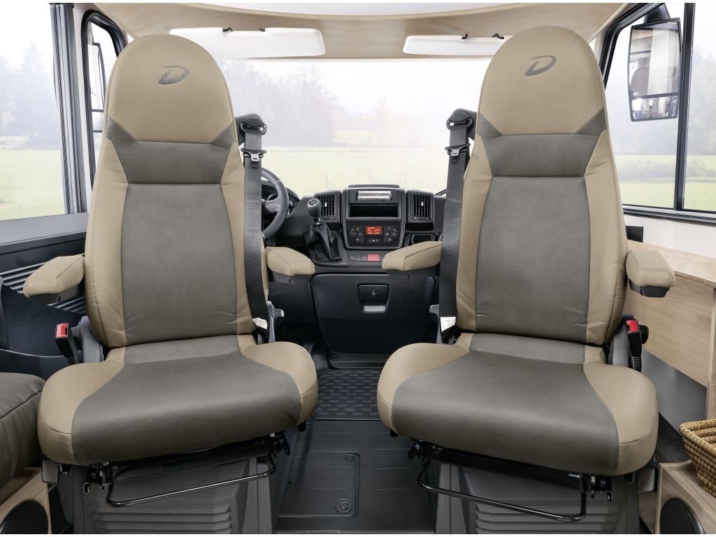 El habitáculo de la Dethleffs Globebus I1 proporciona una conducción segura gracias en parte a la gran luna frontal que facilita una visión panorámica del entorno en una cabina de gran amplitud. Sobre la misma, se suspende una cama basculante de 1,50 metros abatible para un acceso cómodo. La zona del salón está formada por una mesa independiente y sofás en L con acolchados cómodos y ergonómicos.