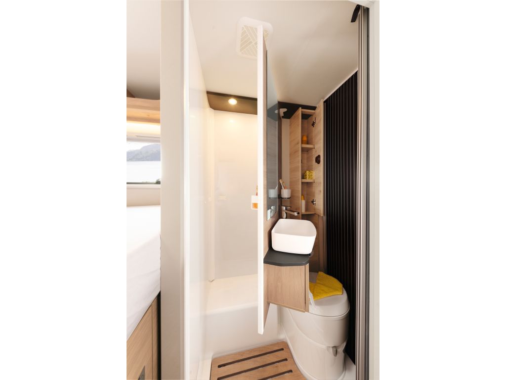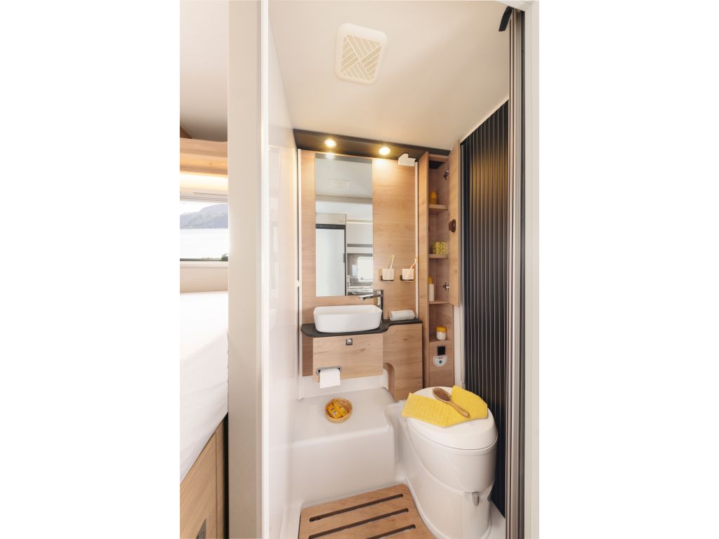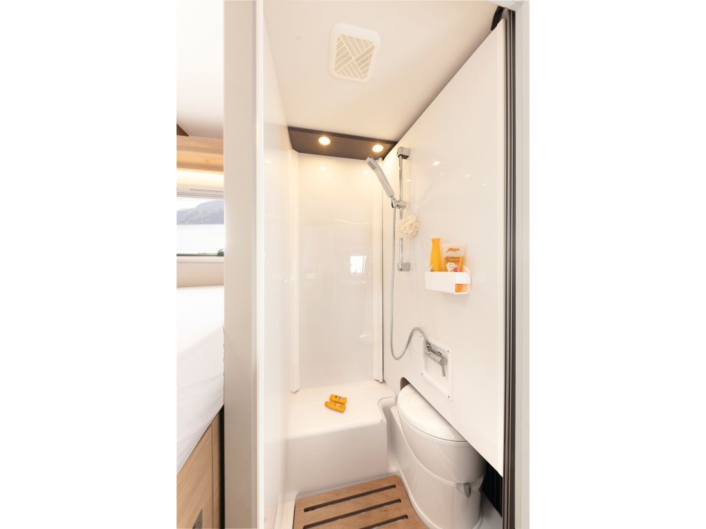 El cuarto de aseo de la Dethleffs Globebus I1 es de tipo Vario, con solo girar la pared trasera, el cuarto de aseo se convierte en una cómoda y amplia cabina de ducha.