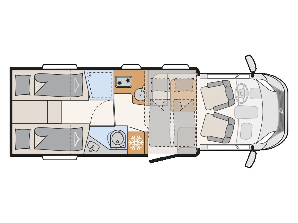La Dethleffs Just Camp T7052 EB, disponible en Yakart Autocaravanas A Coruña, cuenta con un gran garaje trasero, favorecido por su distribución de camas gemelas de 2,15 m de largo.