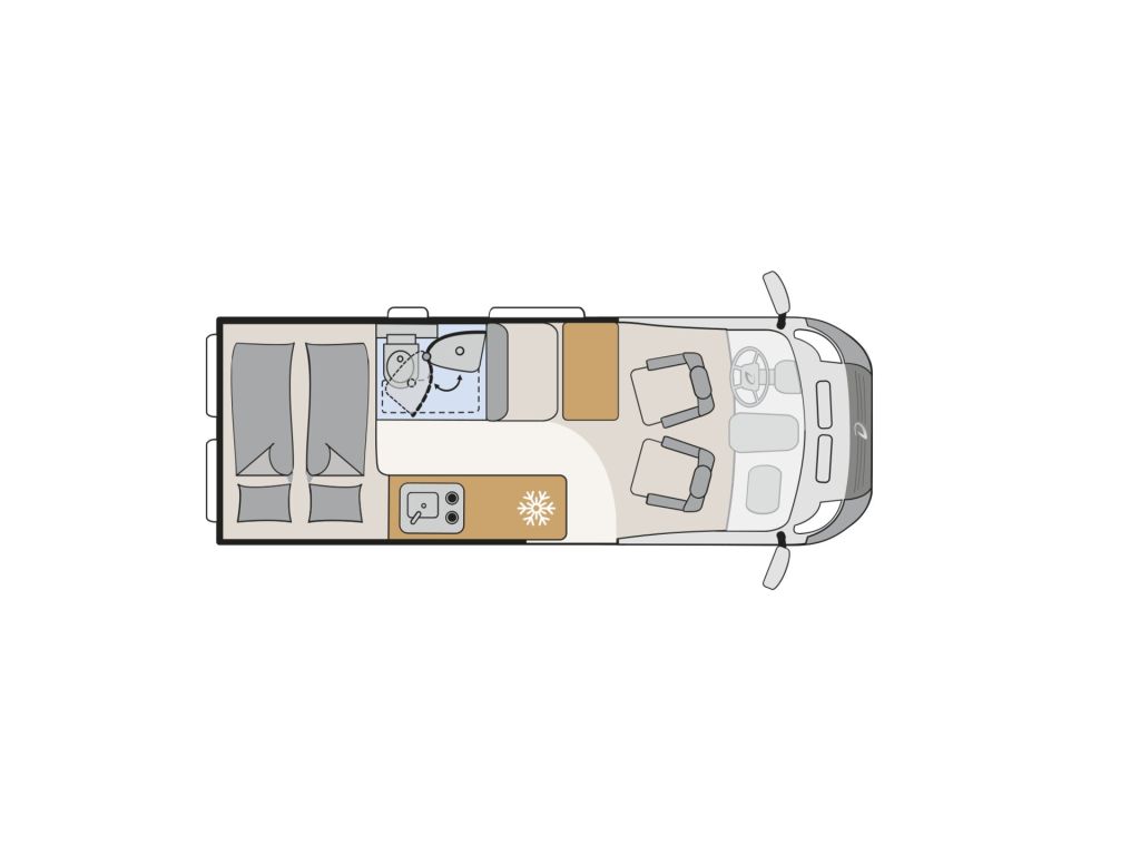 La cocina, uno de los elementos más importantes a la hora de viajar y conseguir la comodidad y funcionalidad de un hogar, incluye un frigorífico de compresor de 84L con congelador de 6L. Este se encuentra situado a una altura ergonómica de fácil acceso en la zona de entrada, lo que permite hacerlo desde el interior del vehículo y desde el exterior. Para ampliar el espacio de trabajo, cuenta con una extensión abatible en el lateral de la encimera.