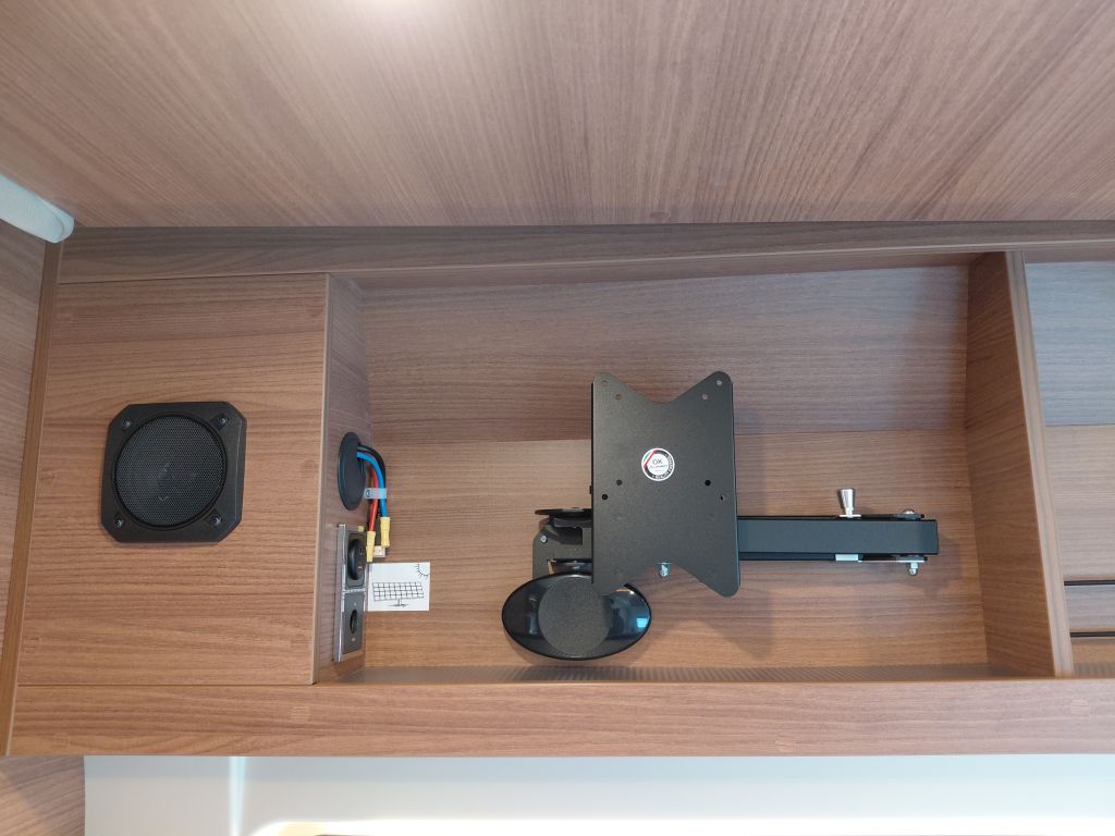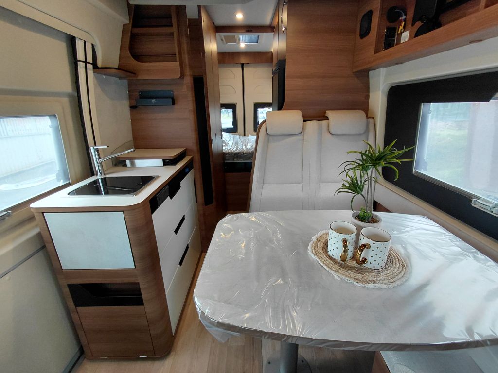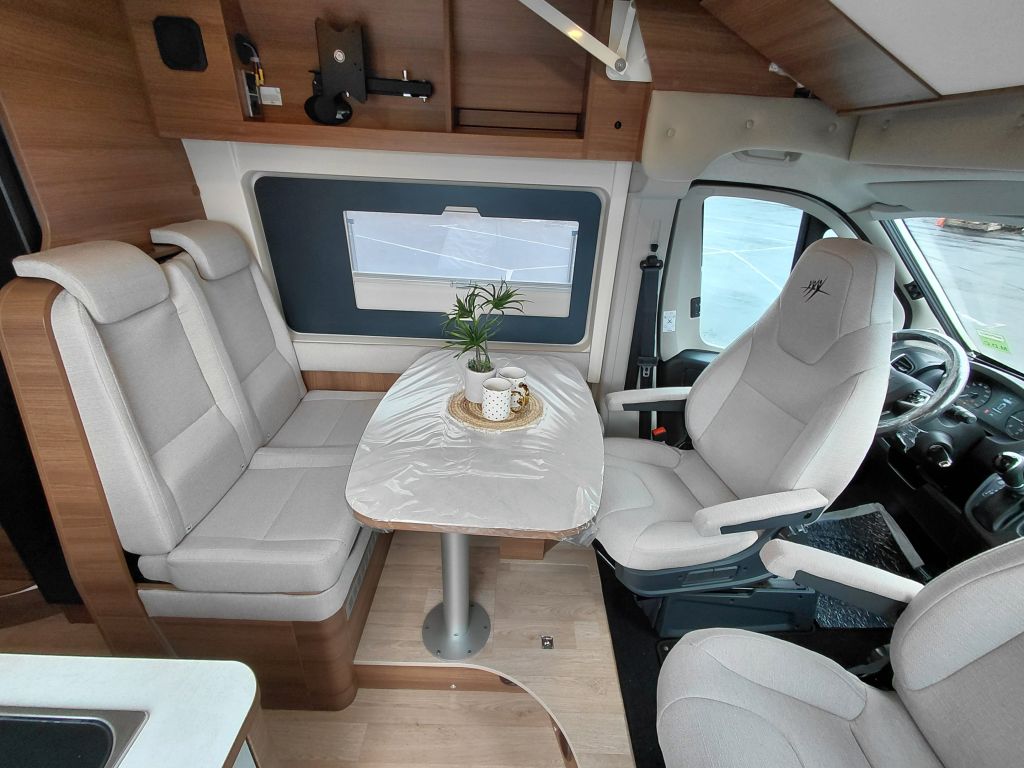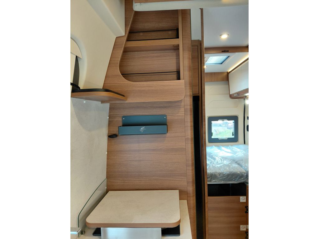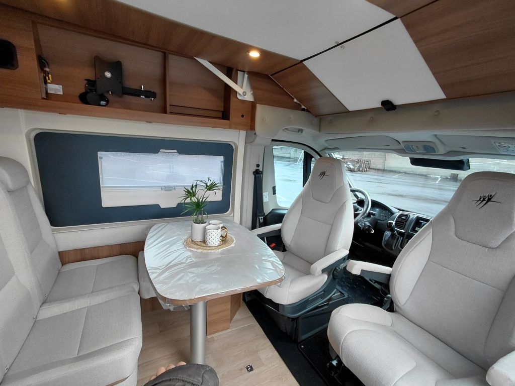 Dispone de espacio de almacenamiento bajo la mesa del comedor, foco de iluminación bajo los muebles altos con toma USB integrada y preinstalación 12V-HDMI para TV con soporte. En los modelos compatibles, incorpora mesa extensible, optimizando el espacio según las necesidades del viaje.