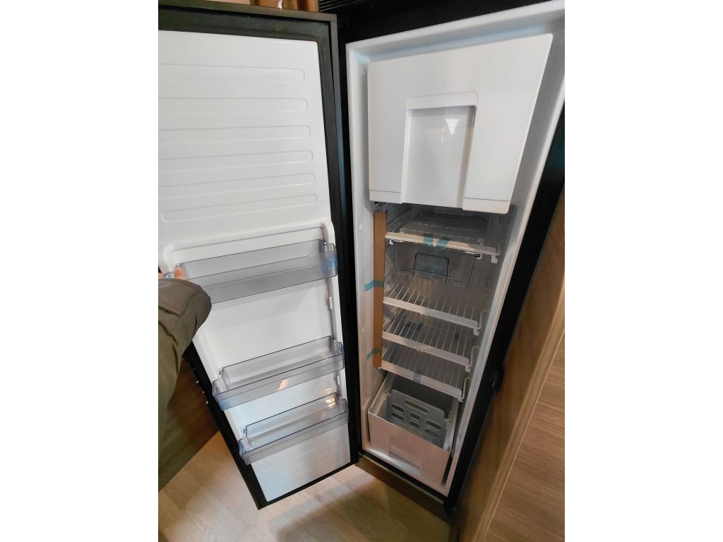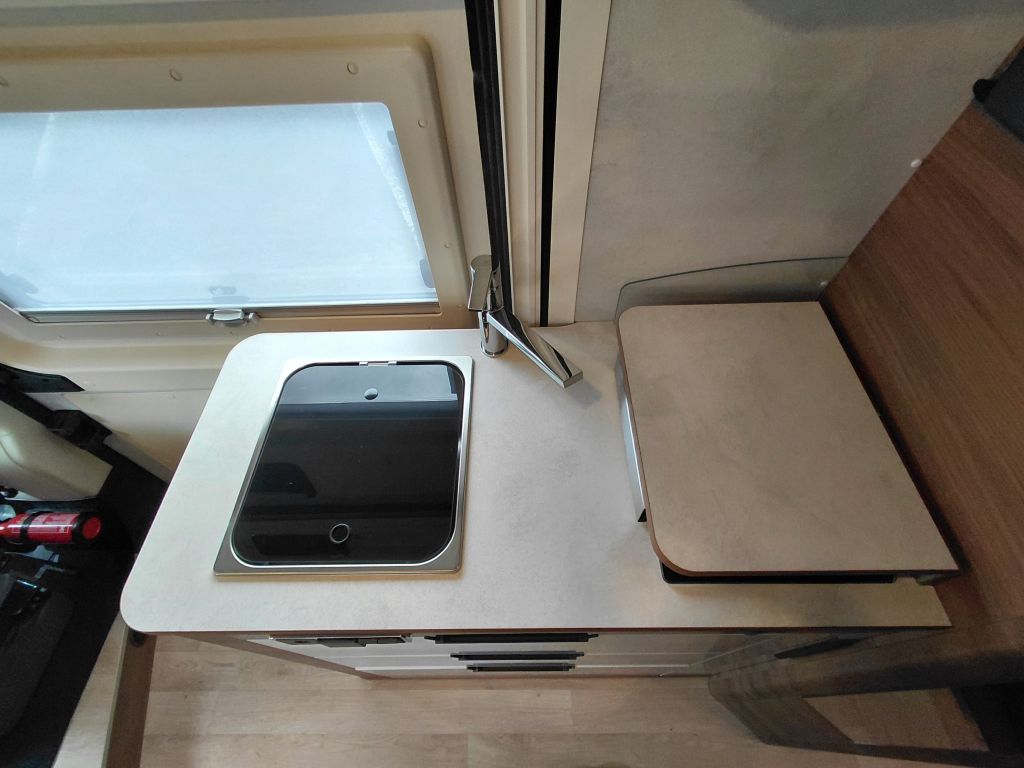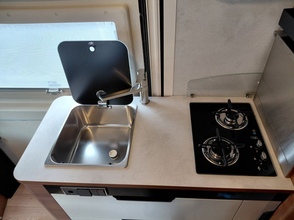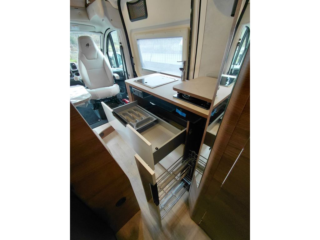 La cocina combina diseño y practicidad, con cajones de frontal blanco y tiradores integrados en negro mate, frigorífico con compartimento congelador y retroiluminación inferior del mueble para una mayor visibilidad. Está equipada con maxi fregadero de acero inoxidable con tapa de cristal negro brillante, grifo de latón con cartucho cerámico y placa de cocina de acero inoxidable de dos fuegos con tapa de cristal negro. Incluye extensión de encimera, cubo de basura integrado, portaespecias, cesta metálica portabotellas y numerosos espacios de almacenamiento, tanto en armarios como en cajones cuberteros y caceroleros. Todo el conjunto cuenta con revestimiento interior de PVC de alta resistencia, cierre centralizado eléctrico y alarma de seguridad al arrancar el motor si los cajones no están bloqueados, garantizando comodidad y seguridad durante la marcha.