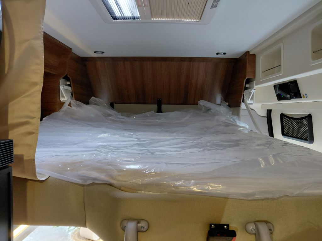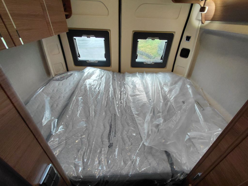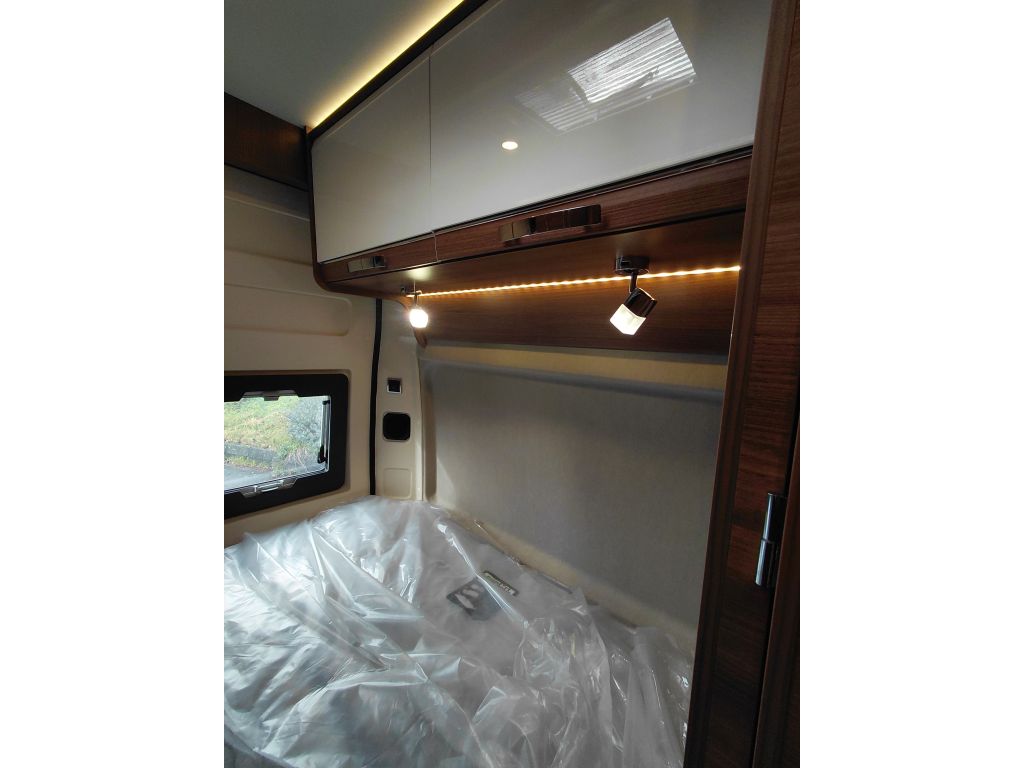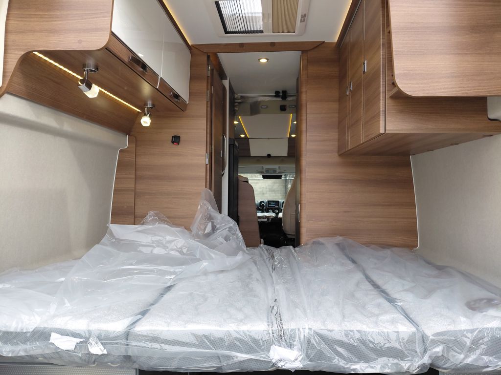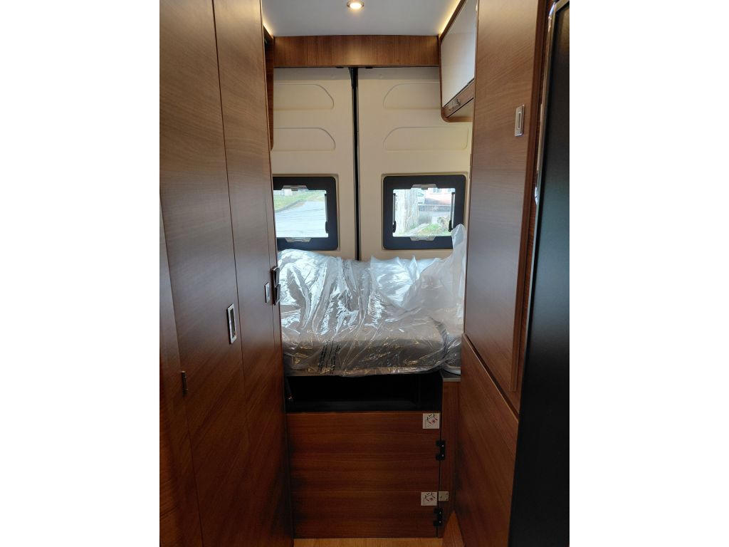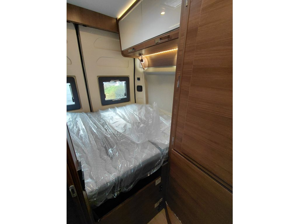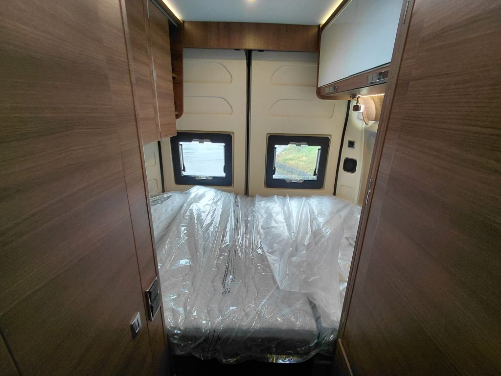 El dormitorio ofrece un espacio pensado para el descanso, con cama fija equipada con somier de marco de aluminio con láminas y colchón BULTEX de alta resiliencia, que asegura un descanso de calidad tras cada jornada de viaje. El conjunto se completa con claraboya con mosquitera y oscurecedor, revestimiento del colchón en tejido elástico de alta calidad, altavoces integrados en el dormitorio y espacios de almacenamiento en el dintel trasero, aprovechando al máximo cada centímetro disponible.