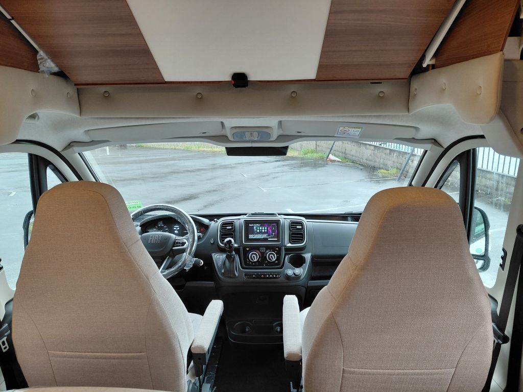 La cabina está pensada para facilitar los trayectos largos, con dirección asistida eléctrica, elevalunas eléctricos delanteros y oscurecedores integrados en parabrisas y ventanillas laterales. Los asientos de cabina regulables en altura, giratorios y con doble reposabrazos ajustable, tapizados a juego con la vivienda, ofrecen una posición de conducción cómoda y ergonómica.