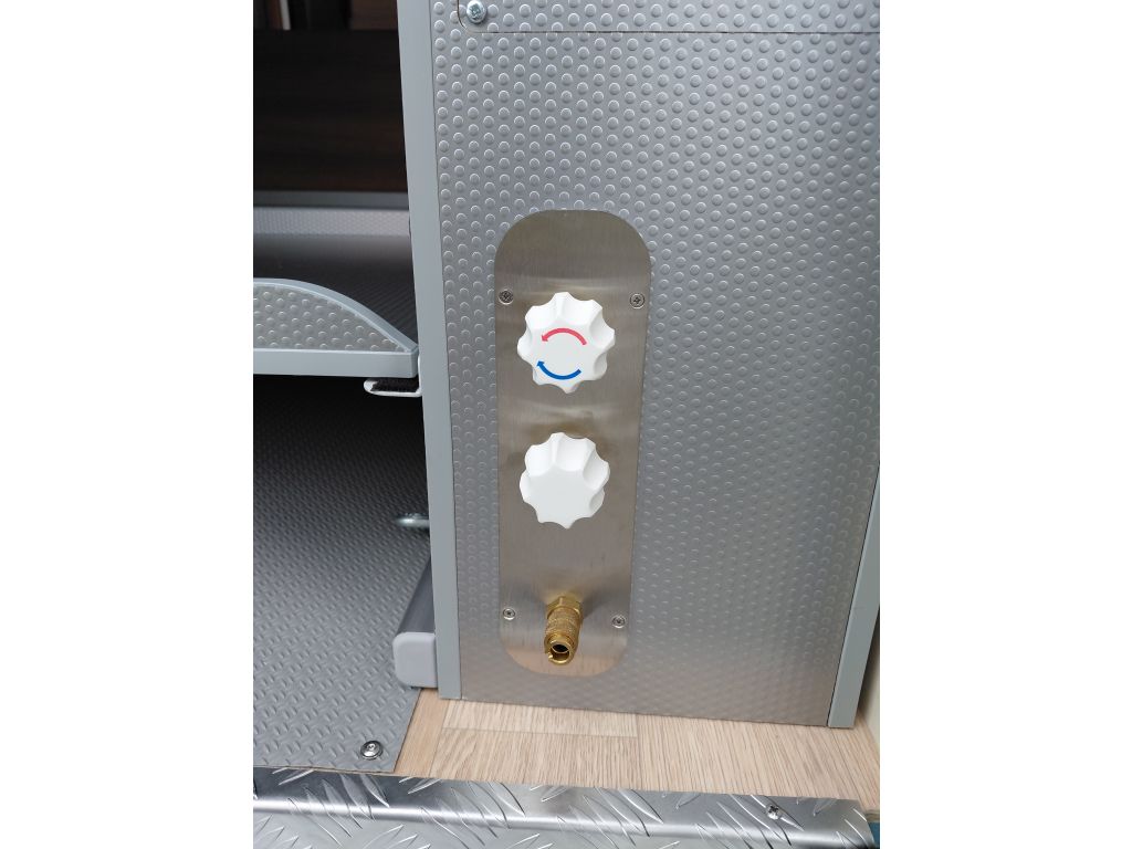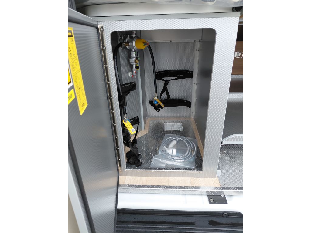 La zona de vivienda cuenta con un completo equipamiento pensado para la autonomía y el confort en ruta. Dispone de panel de control digital, preinstalación para panel solar, dos baterías AGM de 92 Ah con sistema de acoplamiento y refuerzo, y panel de fusibles centralizado con salidas protegidas para accesorios. Incluye cinturones de seguridad de 3 puntos con tensor y sistema ISOFIX, ducha exterior con agua caliente y fría, altavoz adicional en el salón, toma exterior de 230 V y indicadores de nivel de agua limpia y aguas grises, garantizando un uso práctico, seguro y confortable en cualquier destino.