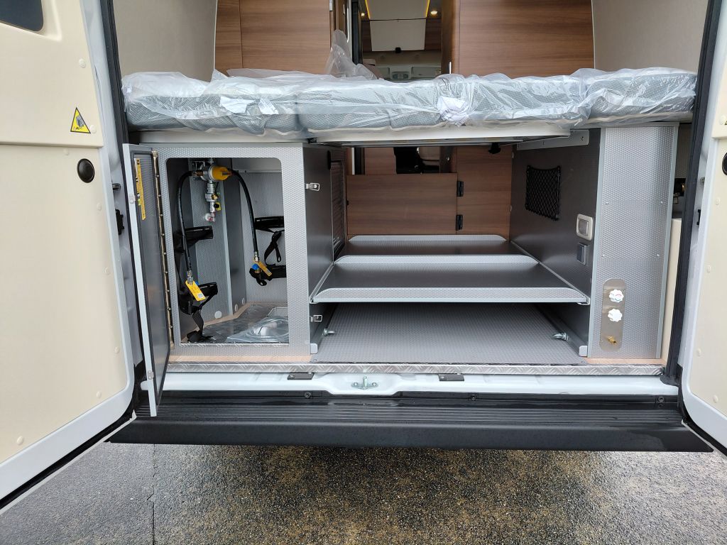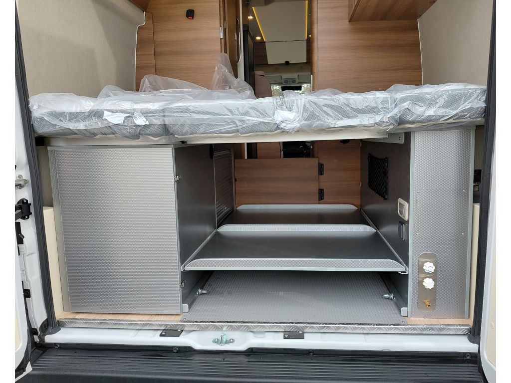 El garaje trasero destaca por su gran capacidad y robustez, pensado para un uso intensivo en viajes largos. Dispone de paredes reforzadas con revestimiento TITAN, suelo del garaje reforzado, y garaje calefactado con revestimiento protector. Incluye un compartimento con cortina corredera para un acceso cómodo en cualquier momento, módulos de almacenamiento intermedios desmontables y rieles con ganchos de sujeción, que facilitan una organización segura y eficiente del equipaje y material de viaje.