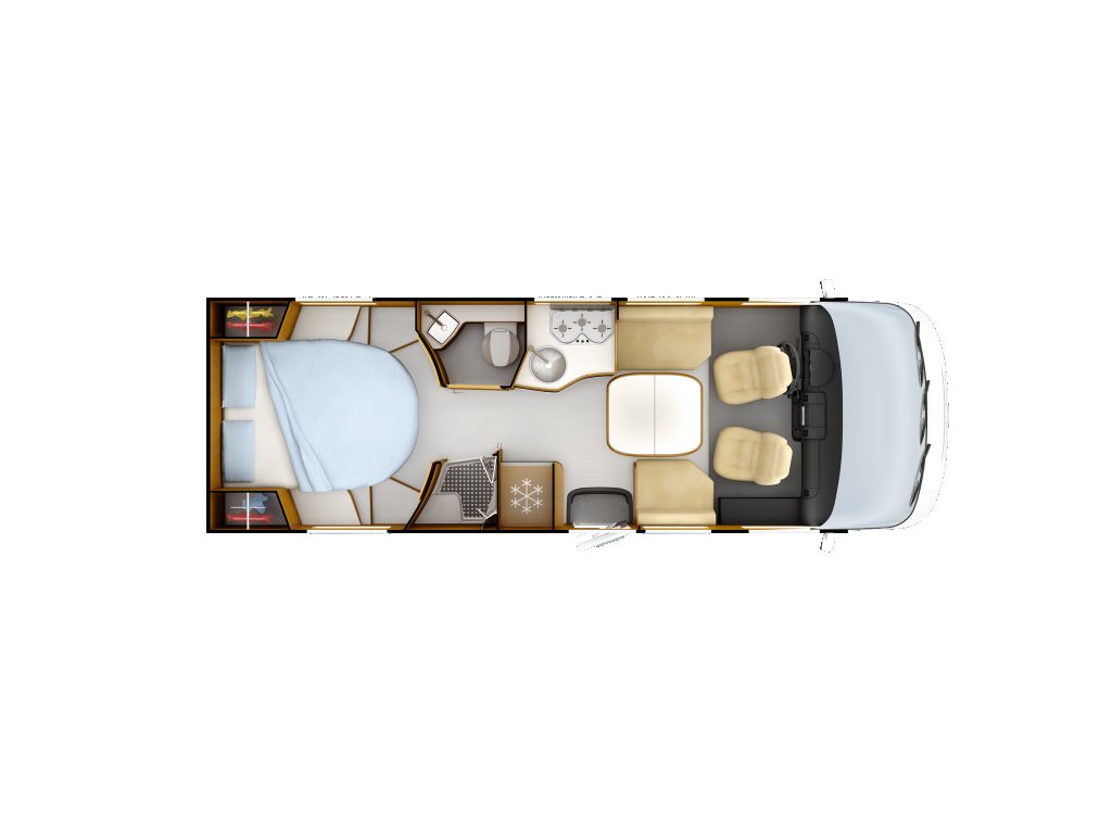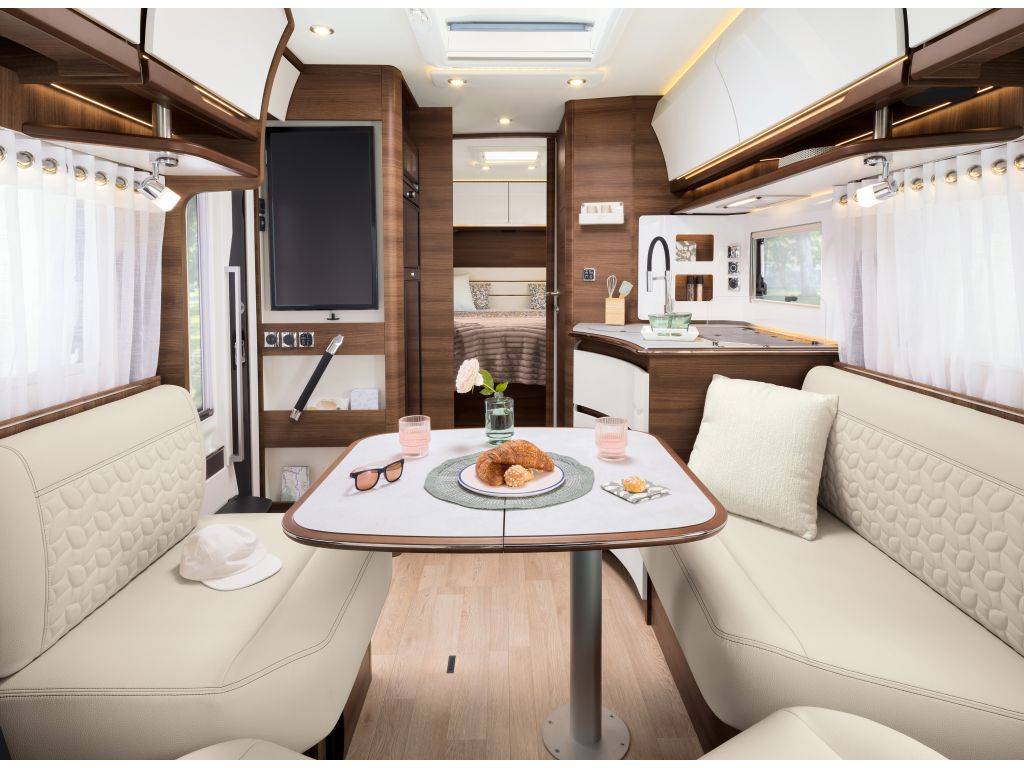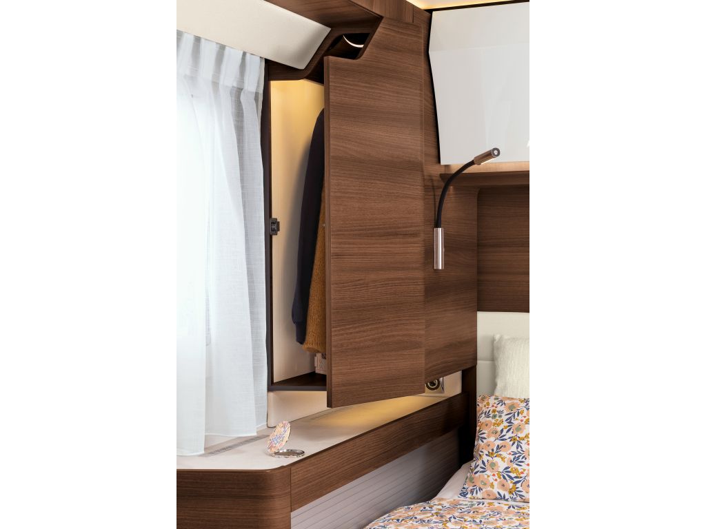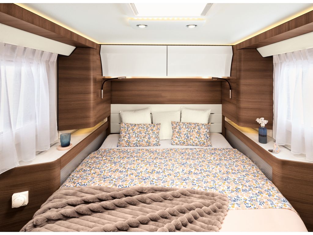 Los acabados de la encimera y la mesa del salón tienen un revestimiento laminado mineral claro con el objetivo de presentar un espacio resistente sin renunciar al toque de diseño contemporáneo. Por su lado, las puertas de los armarios altos son blanco brillante y cuentan con cierre push lock, reforzando la sensación de modernidad y amplitud. La barra de la cortina con ojales e iluminación indirecta completa el conjunto interior ideado para ofrecer el máximo confort a bordo de la autocaravana.