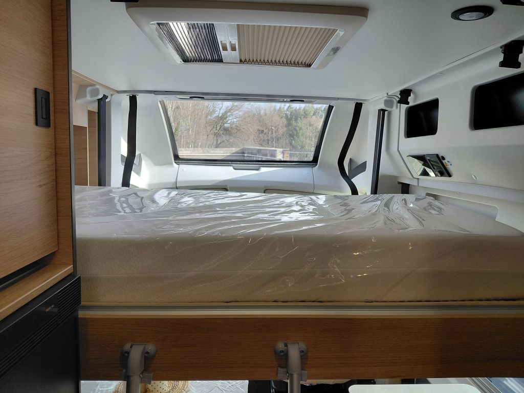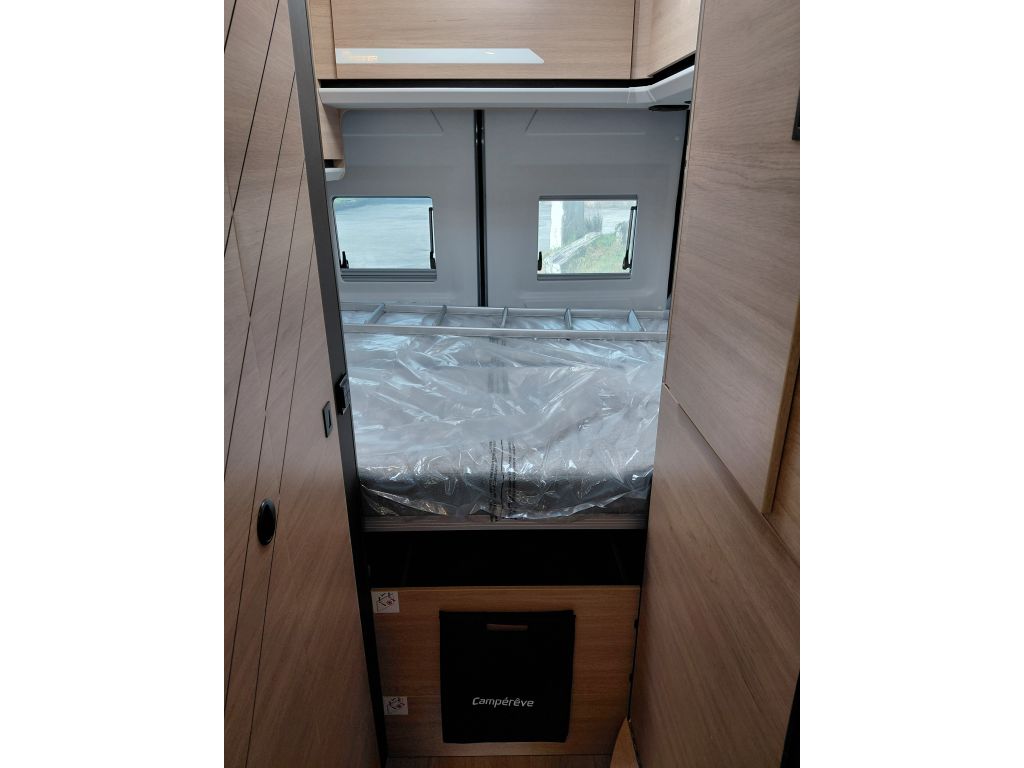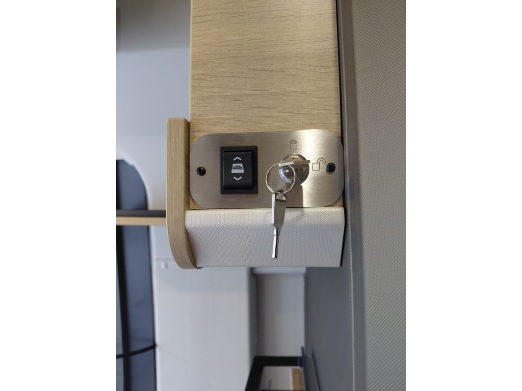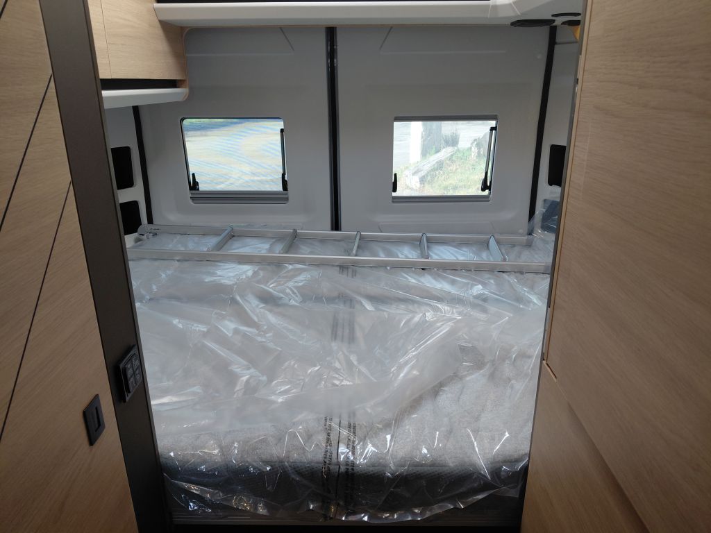 La zona de vivienda está preparada para ofrecer autonomía y comodidad, gracias al precableado para panel solar, que facilita futuras ampliaciones energéticas. El descanso está garantizado con una cama fija equipada con somier de láminas activas multipliegues y un colchón de espuma Bultex de alta resiliencia, diseñado para proporcionar un confort óptimo noche tras noche.