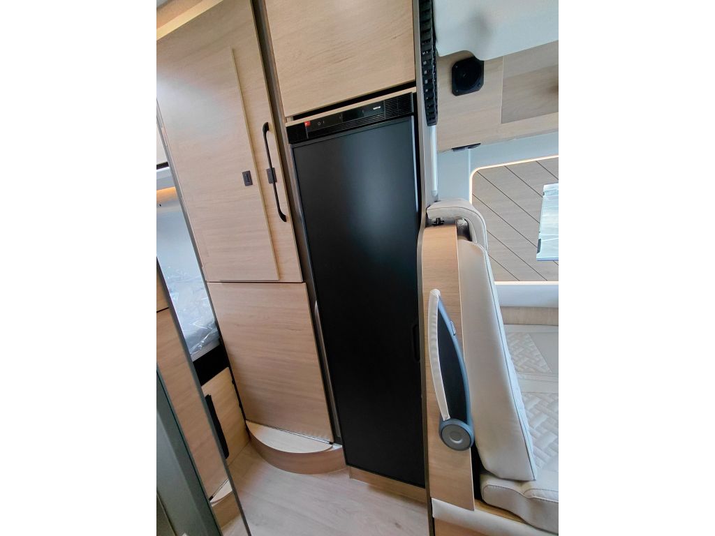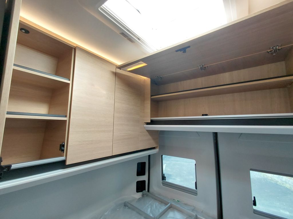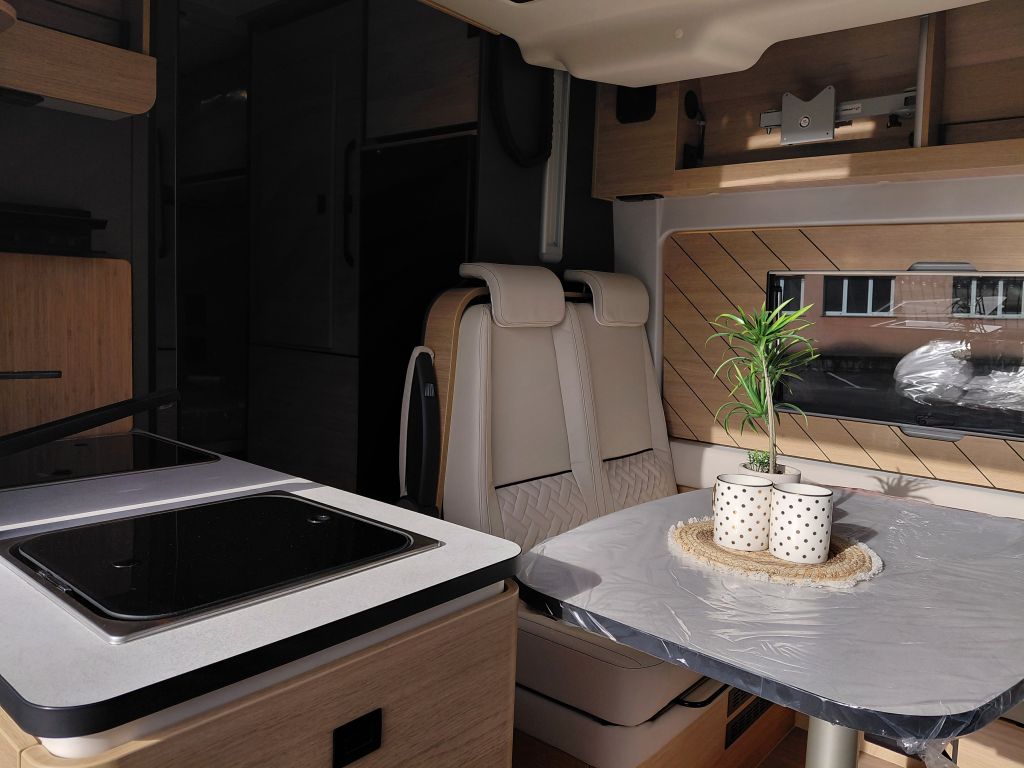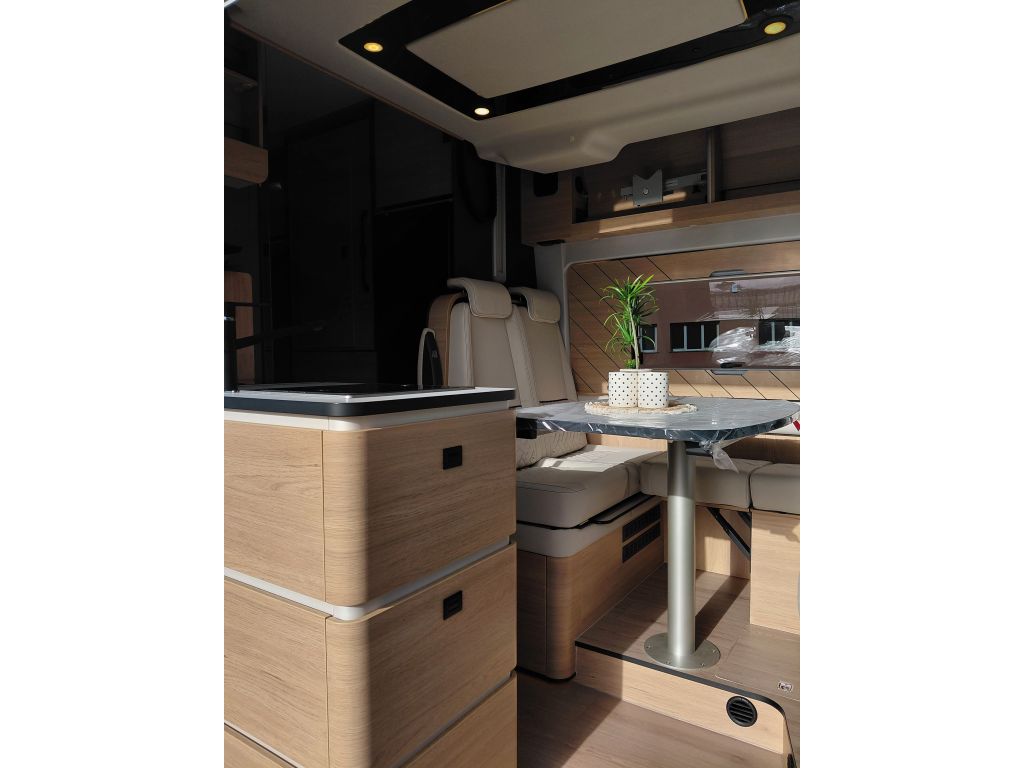 Una banda decorativa de madera, combinada con la retroiluminación lateral, refuerza la sensación de calidez y crea un ambiente interior agradable y acogedor. Bajo la mesa del comedor se integra un práctico arcón de almacenamiento, que proporciona espacio adicional para guardar equipaje y objetos personales.