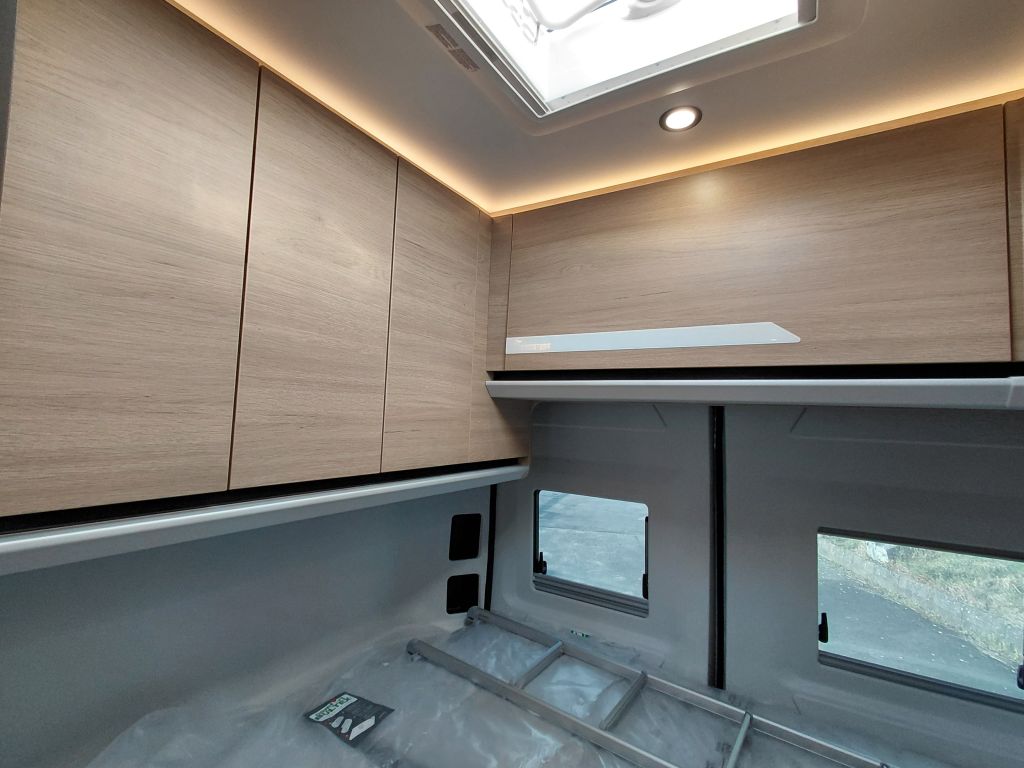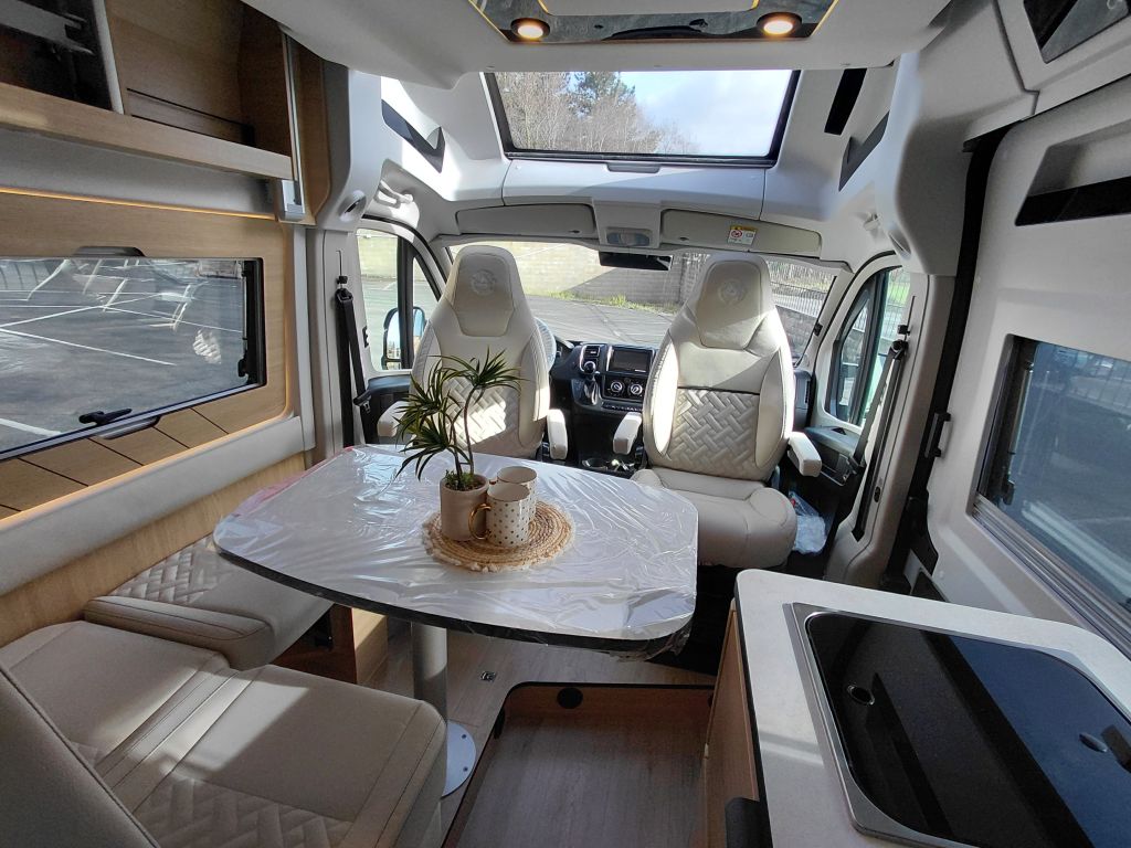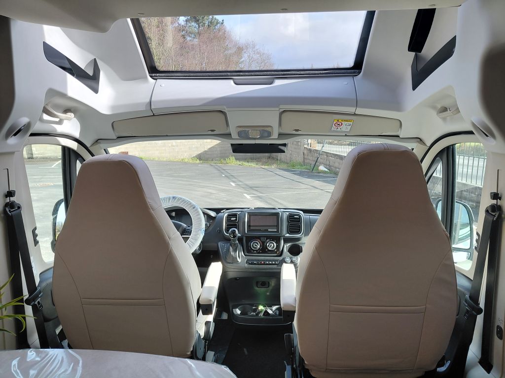 La cabina de la Dreamer CamperFive Fun+ incorpora un amplio techo panorámico Skyview, que favorece la entrada de luz natural y mejora la ventilación interior, aportando mayor sensación de amplitud y confort durante los viajes.