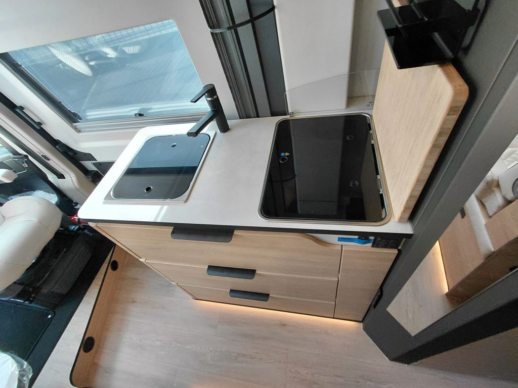 La cocina, uno de los espacios más importantes del vehículo, se caracteriza por estar equipada con todo lo necesario para poder cocinar con todas las comodidades y funcionalidades de un hogar convencional. Para ello, está equipada con: