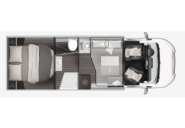 Autocaravana perfilada ROLLER TEAM de cama isla y su caracteristico cuarto de baño completo , generando 3 ambientes independientes y privados